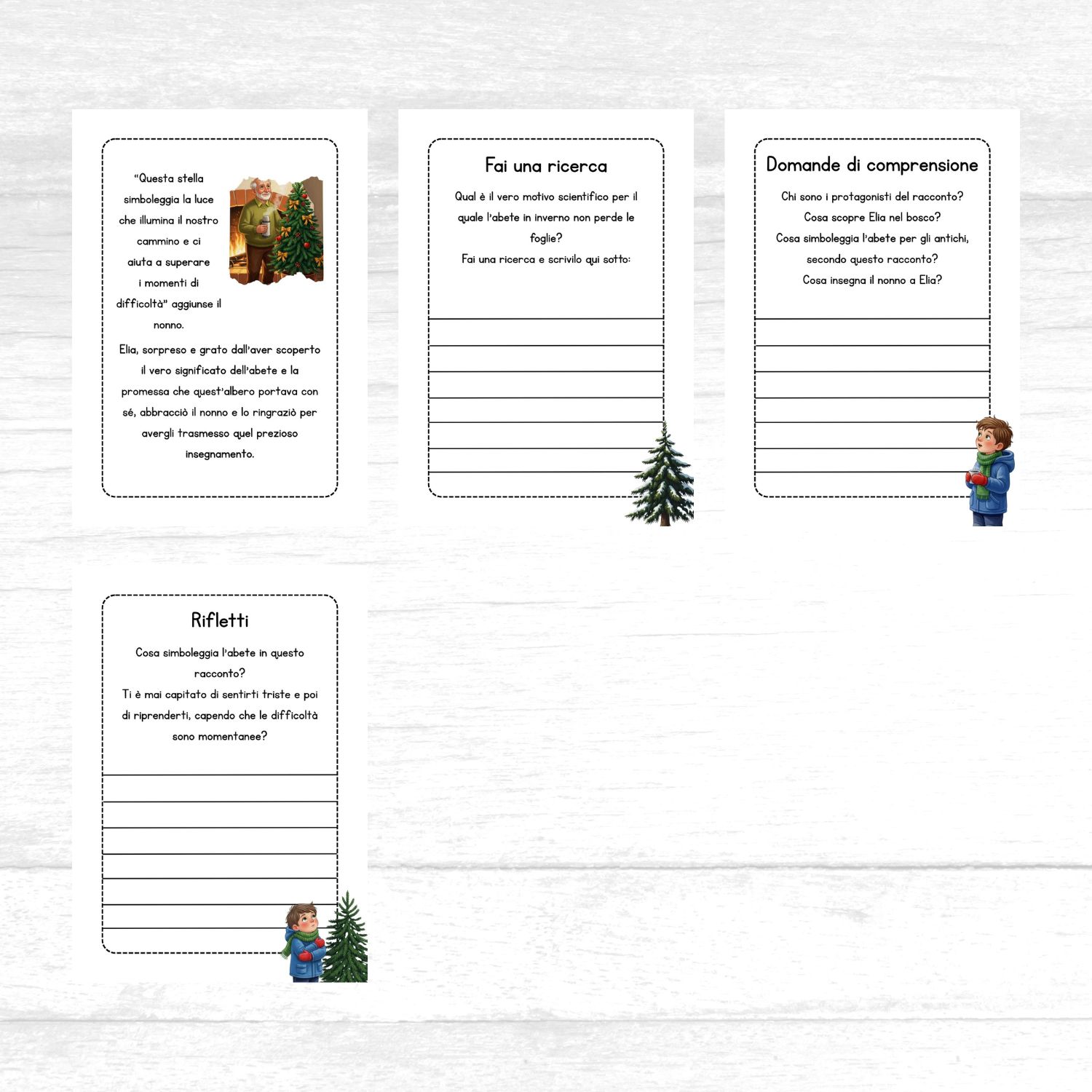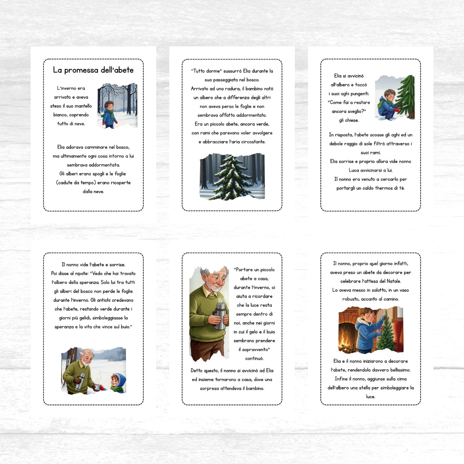 Questo racconto è ideale da leggere in classe o a casa ed è corredato da domande di comprensione, una proposta di riflessione ed una proposta di ricerca legata alla motivazione scientifica per la quale gli abeti restano verdi anche in inverno.