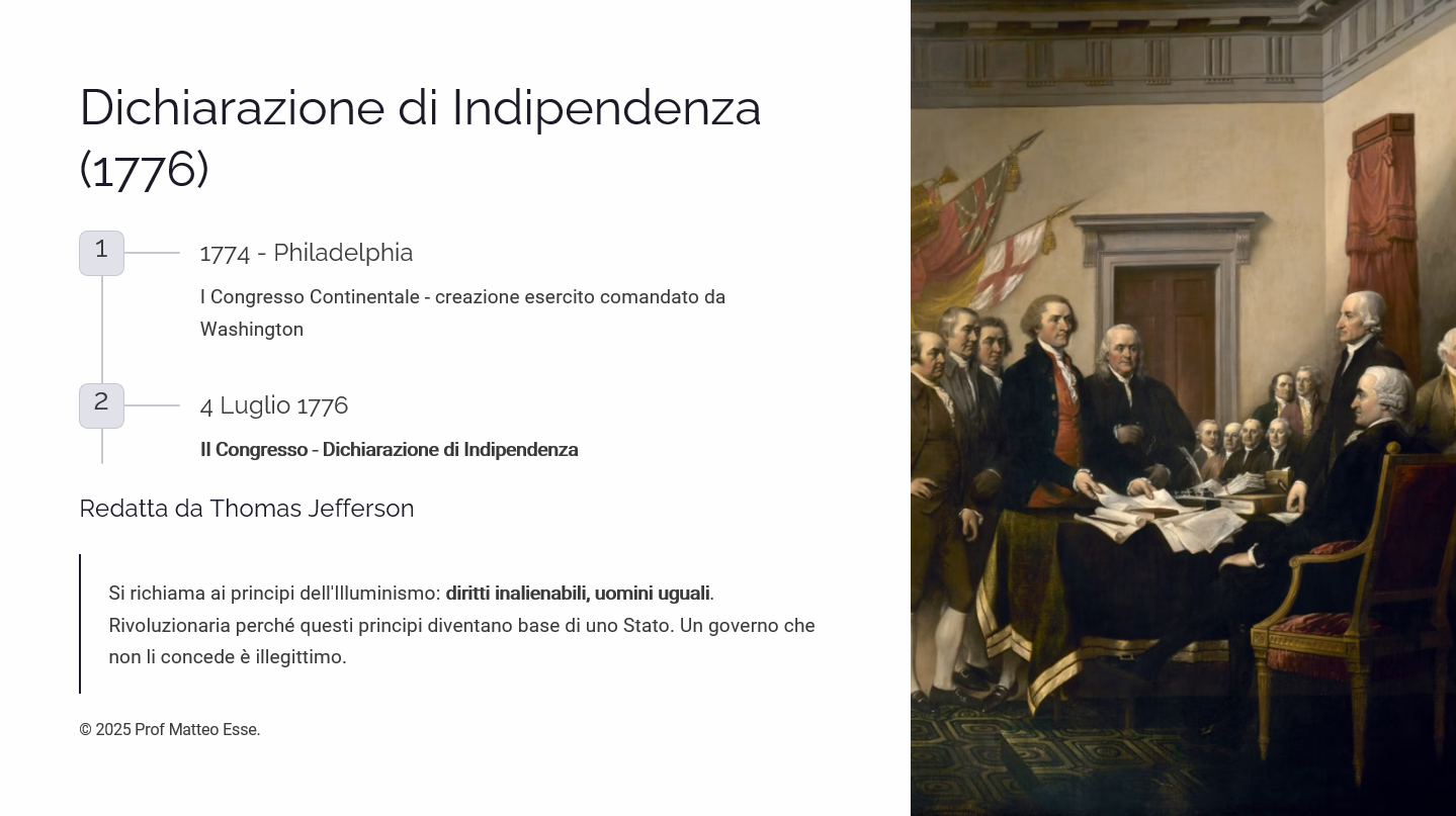 • La Guerra d’Indipendenza: Dal Boston Tea Party (1773) alla Dichiarazione d’Indipendenza (1776), fino alla vittoria di Washington e al Trattato di Versailles (1783).
