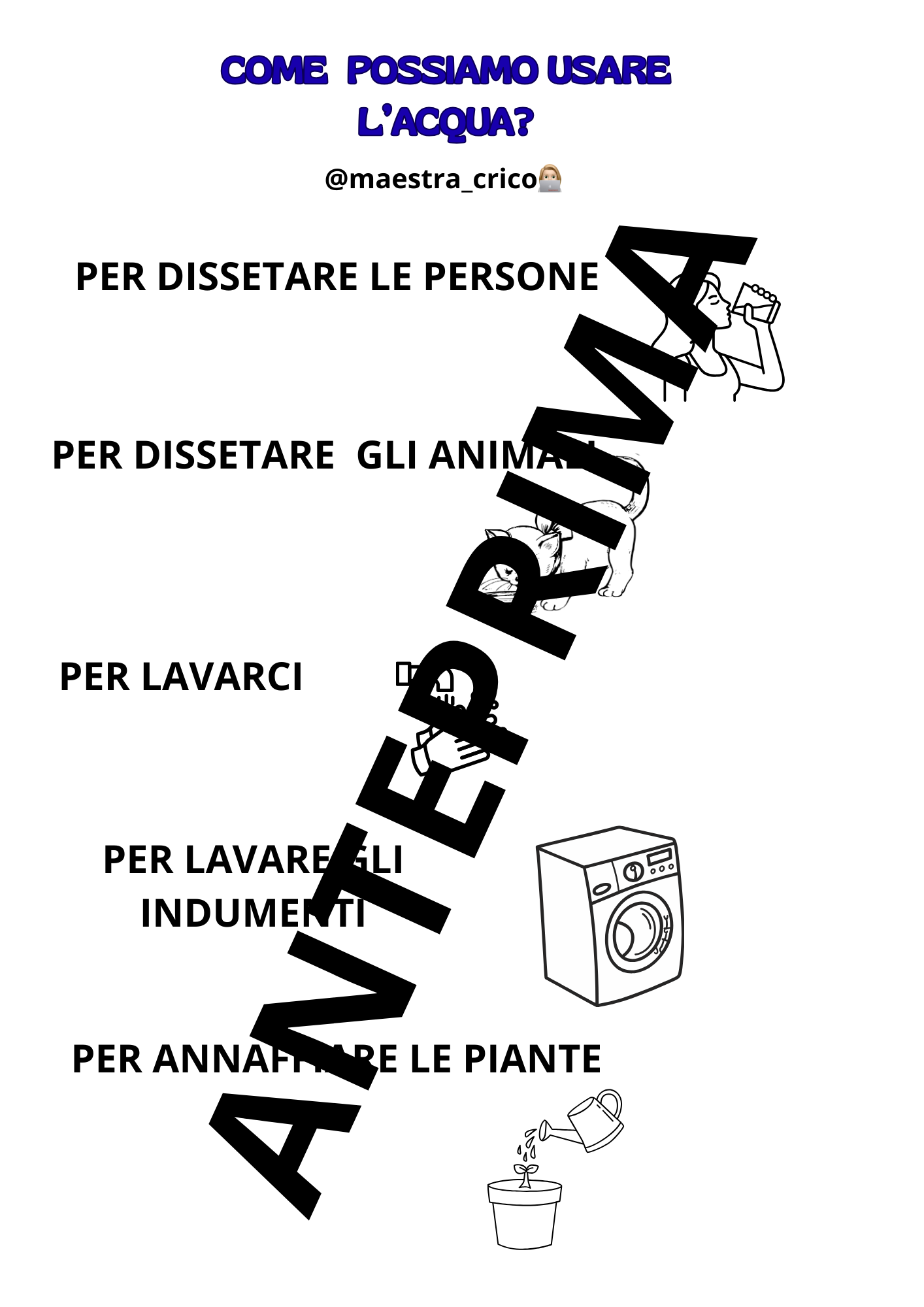 • Come usiamo l’acqua? Un viaggio tra gli usi quotidiani dell’acqua, dal bere al lavarsi, dal lavare i vestiti all’innaffiare le piante.