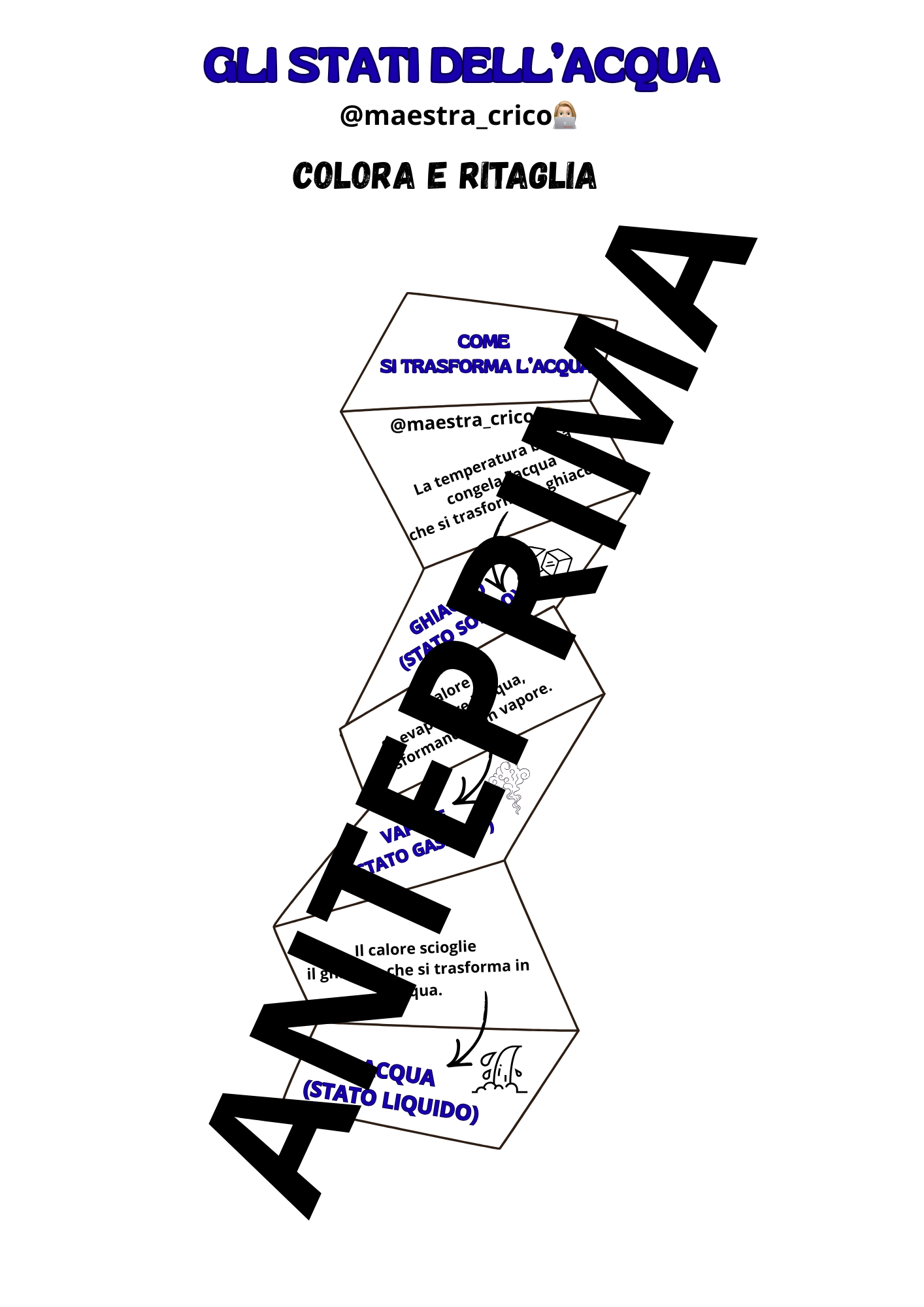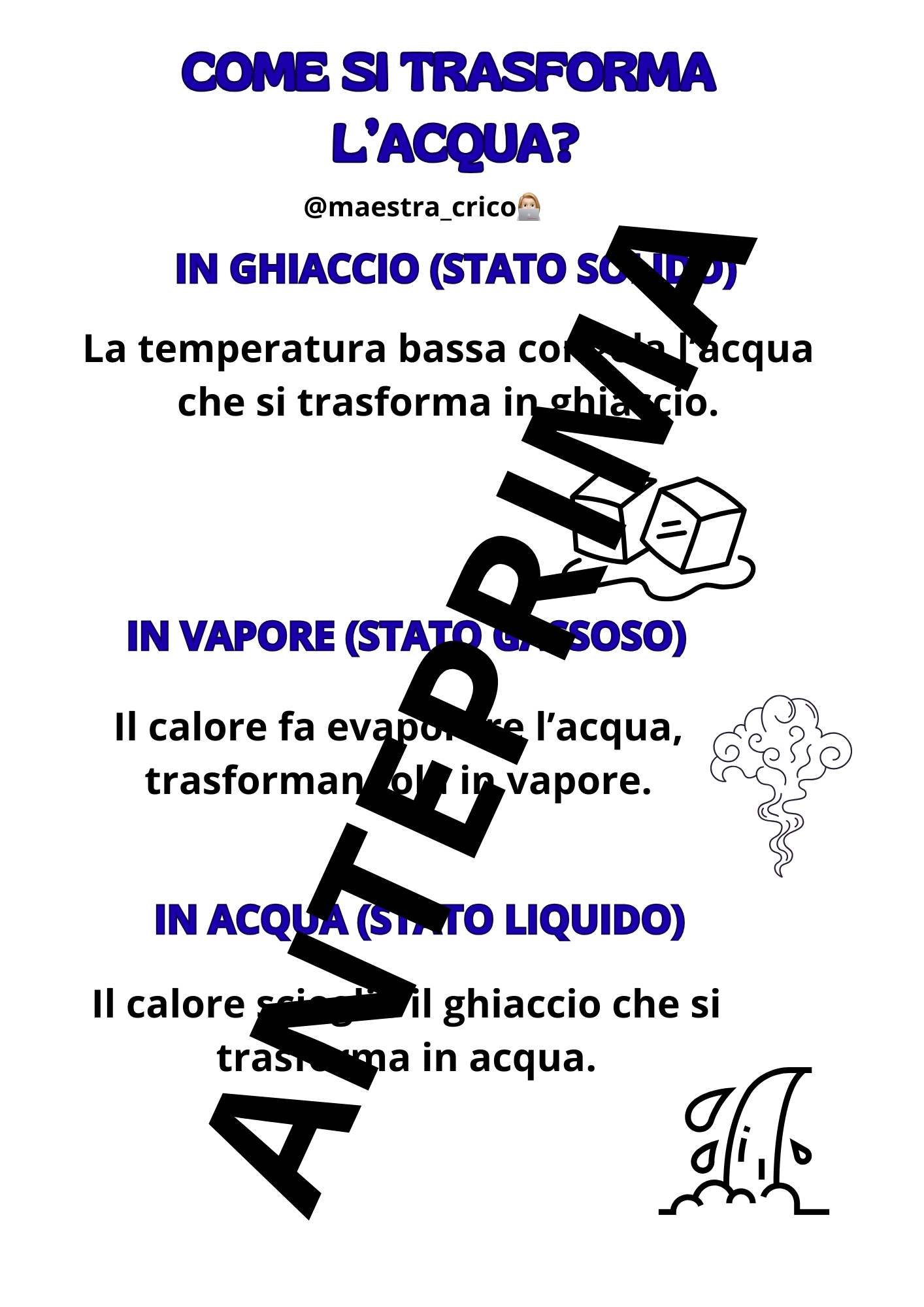• Gli stati e le trasformazioni dell’acqua: Spieghi in modo chiaro e semplice i tre stati (solido, liquido, gassoso) e come l’acqua si trasforma. Include un’attività pieghevole “Colora e ritaglia” per visualizzare il processo.
