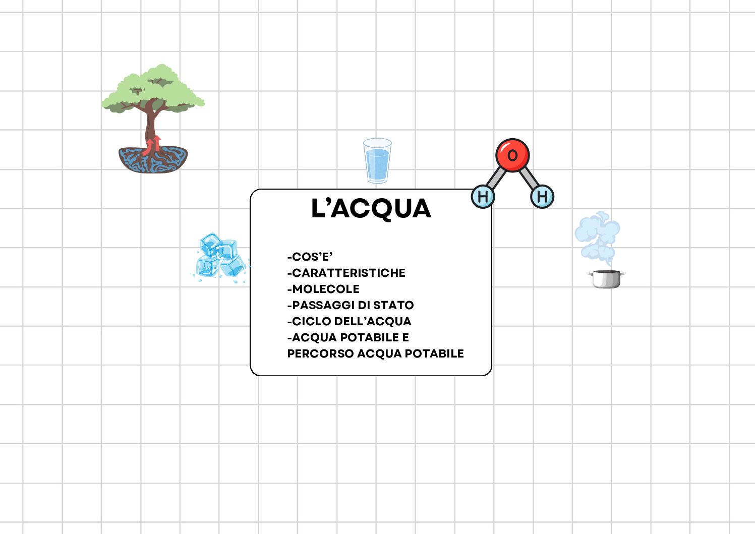 Mappa concettuale per lo studio e il ripasso delle caratteristiche principali dell’acqua, del ciclo dell’acqua e approfondimento sull’acqua potabile.