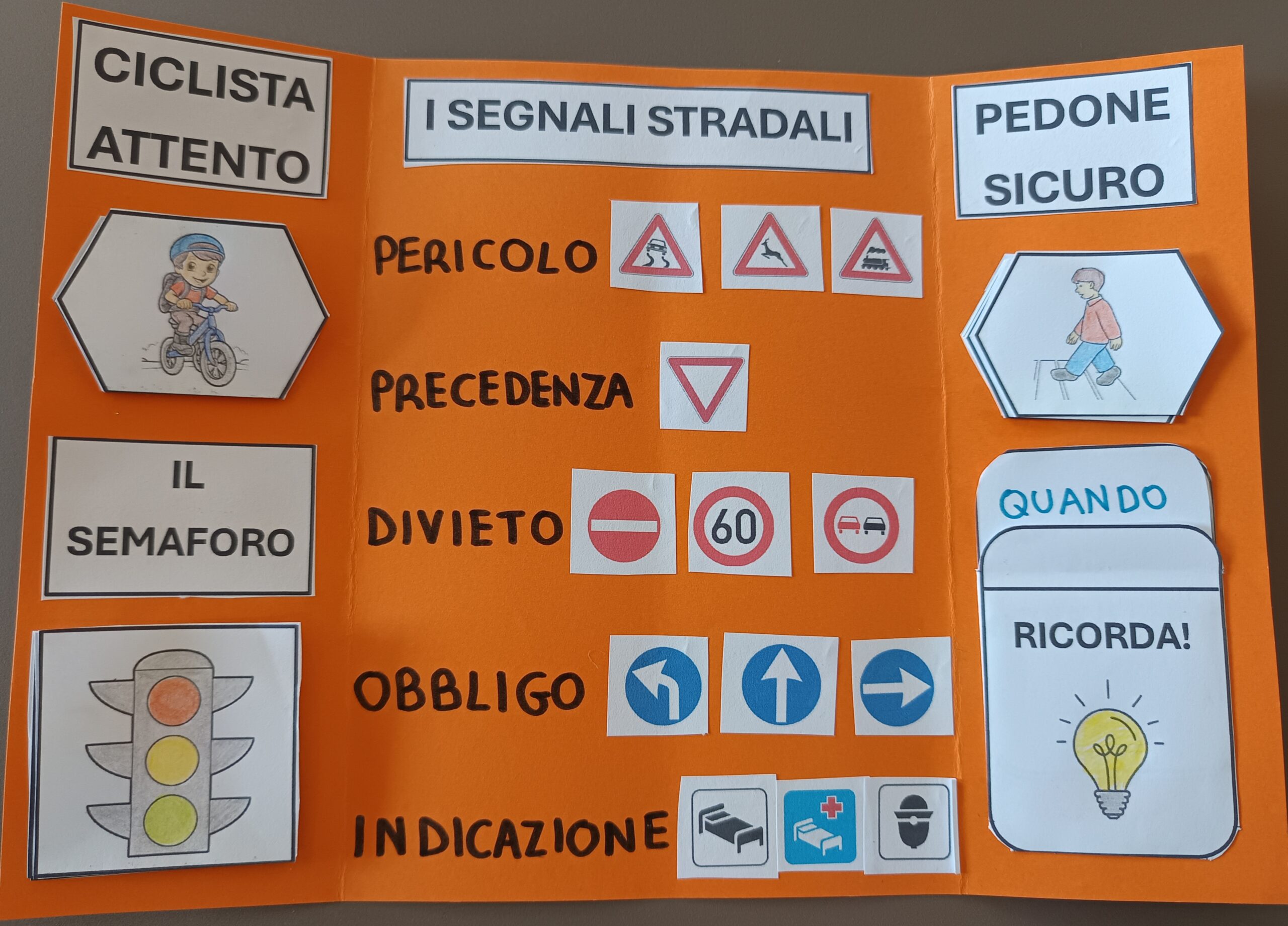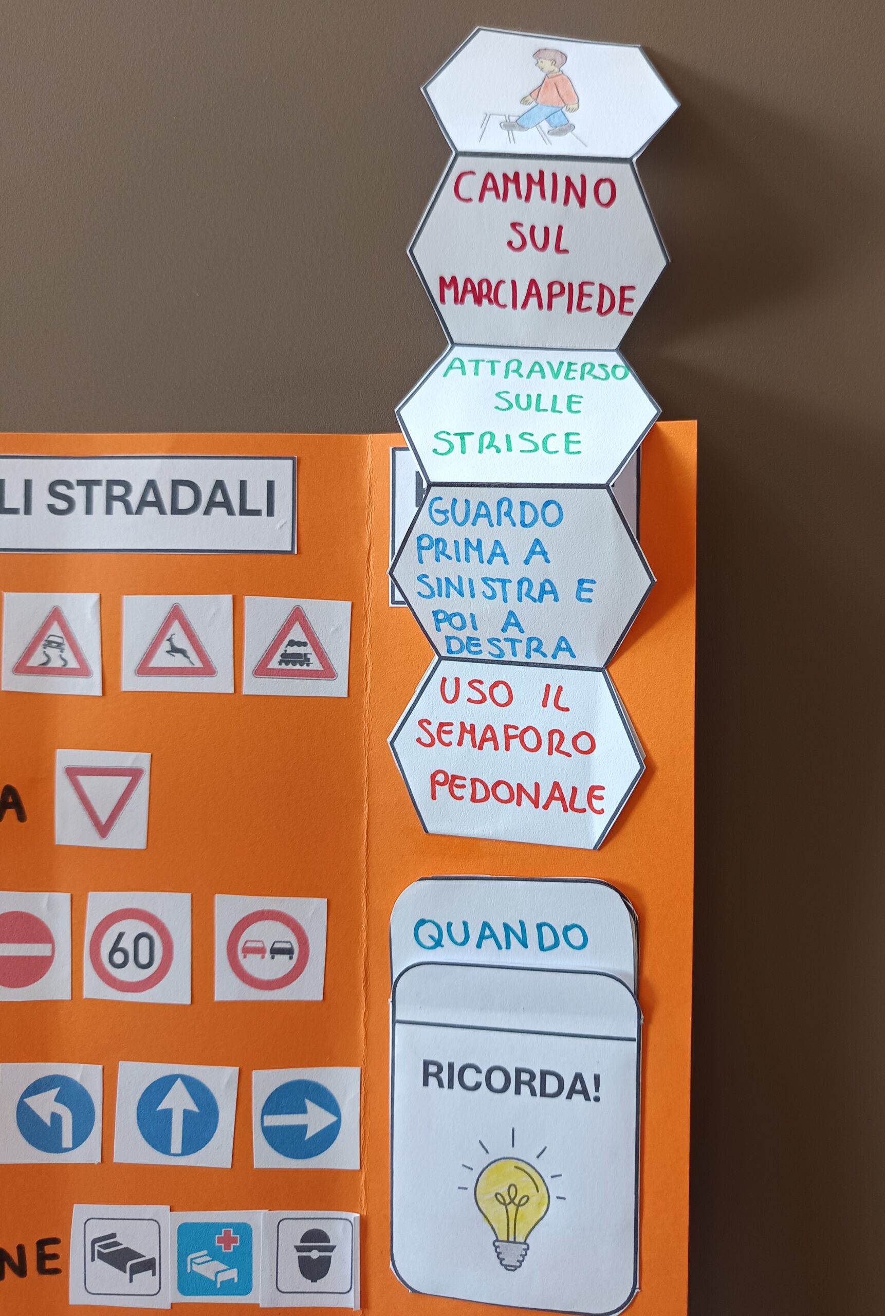 I bambini oltre ad assemblare i singoli pezzi devono scrivere le regole del semaforo, del pedone sicuro e del ciclista attento, nonché domande o affermazioni sulla sicurezza stradale, da inserire nella tasca a sinistra del libricino, che serviranno come ulteriore momento di riflessione.