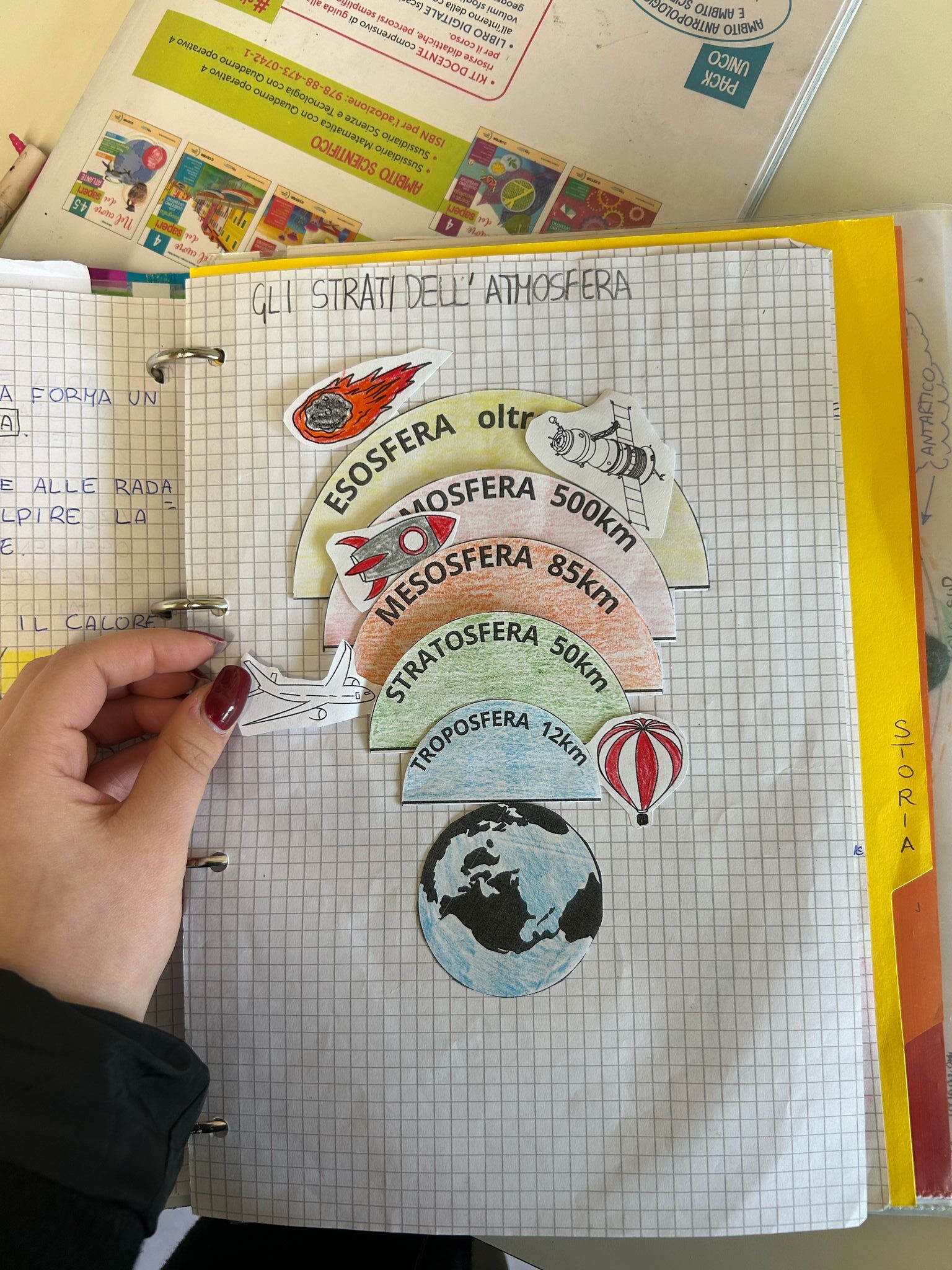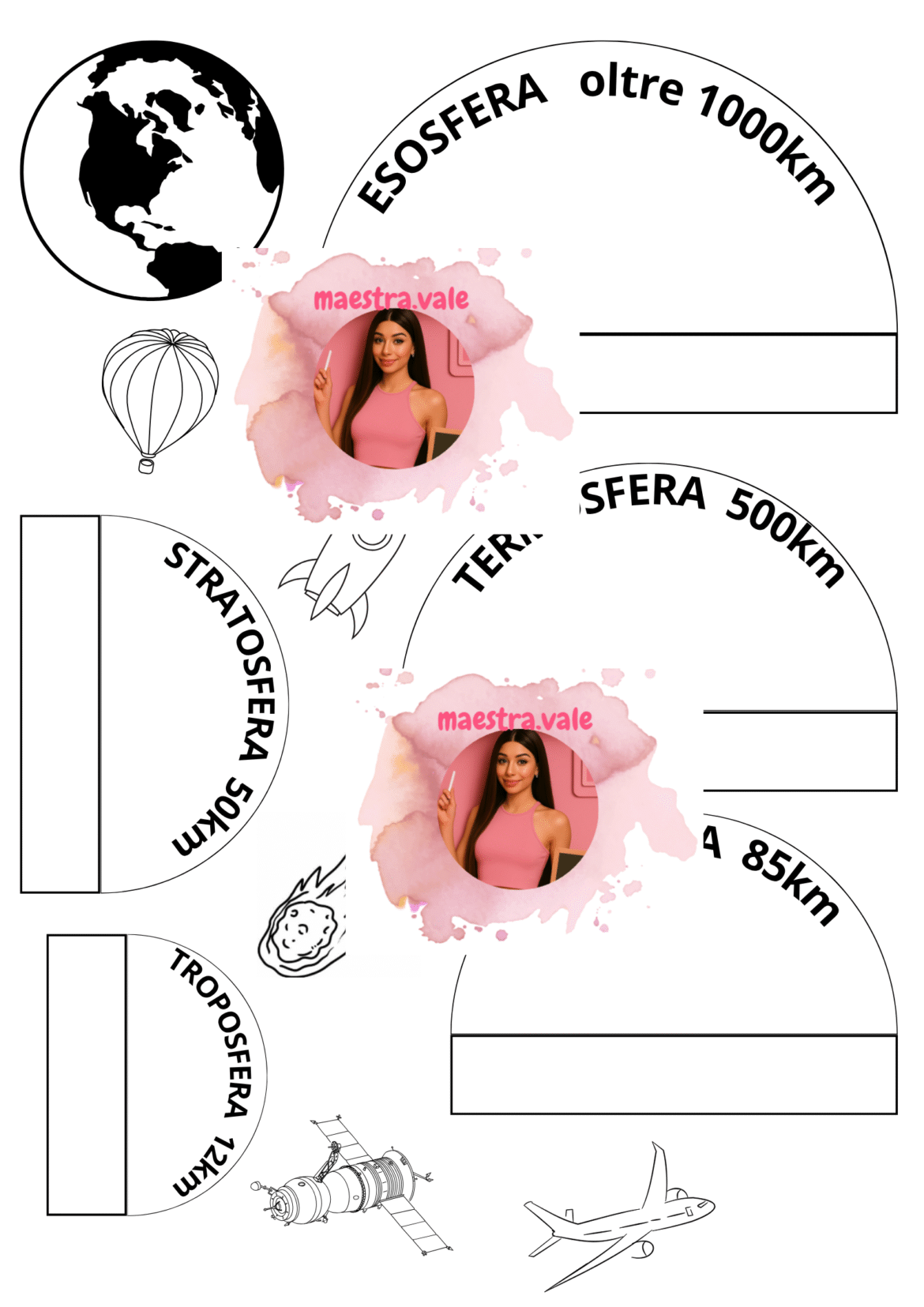 Ogni strato dell’atmosfera (troposfera, stratosfera, mesosfera, termosfera, esosfera) è rappresentato da un oggetto simbolico, facile da riconoscere e perfetto per aiutare la memorizzazione!