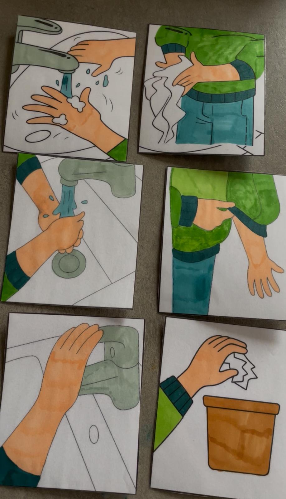 Per rafforzare visivamente,  soffermarsi sui passaggi che caratterizzano il momento ” bagno” /  “lavaggio mani”,  supportare nell’ acquisizione delle autonomie.