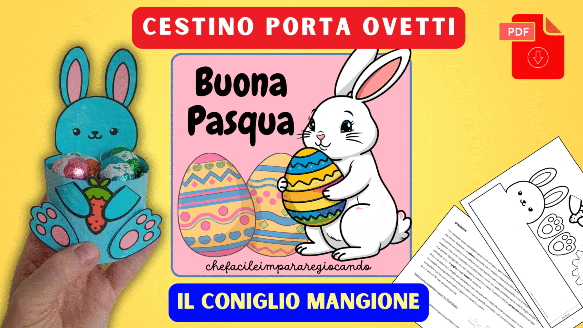 Ogni bambino potrà colorare il coniglietto come preferisce, scegliere il cartoncino e creare il proprio cestino pasquale personalizzato. Il risultato è un lavoretto perfetto da portare a casa o da usare come piccolo regalo di Pasqua.