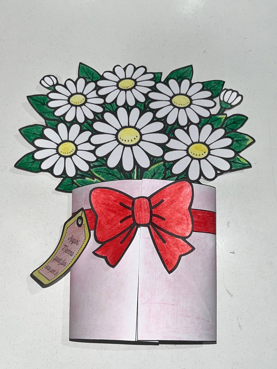 Il file PDF pronto da stampare contiene tutte le sagome necessarie per costruire il lavoretto: vaso, fiocco decorativo, etichetta con augurio e fiori. I bambini dovranno semplicemente stampare, colorare, ritagliare e assemblare le parti per creare un bellissimo vaso con margherite o rose che si apre come un biglietto sorpresa.