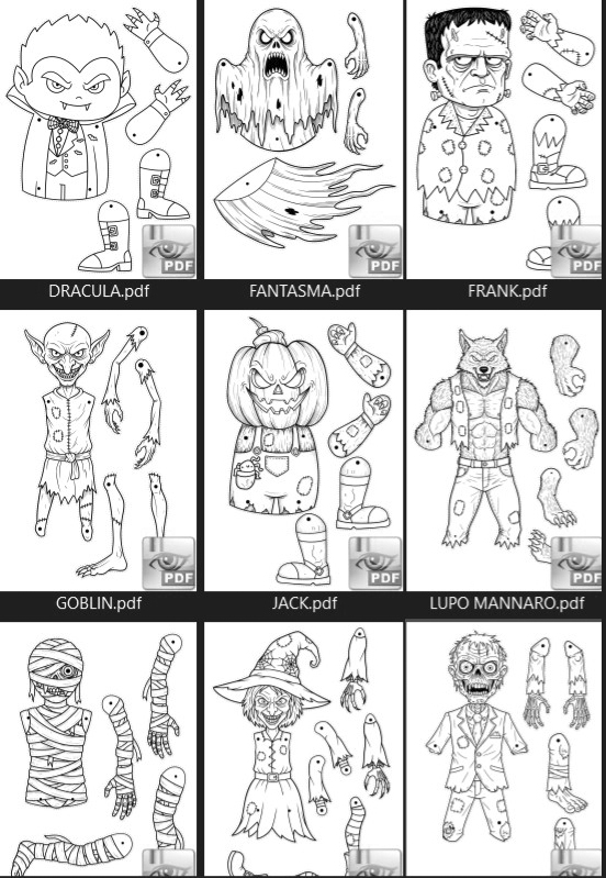 Schede PDF in formato A4 con nove diversi personaggi di halloween da colorare, ritagliare e assemblare.