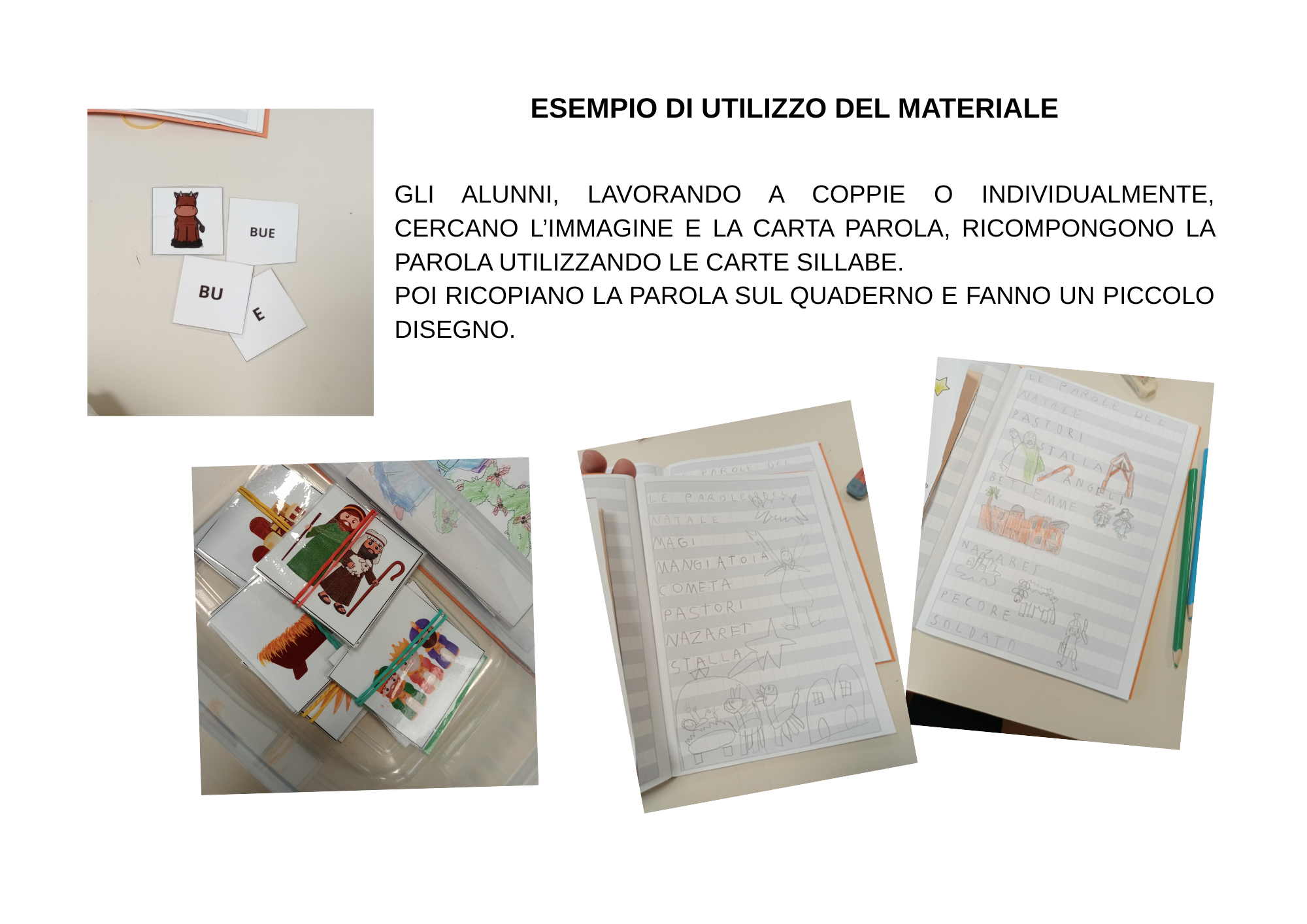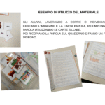 • carte con le sillabe: Un set completo di sillabe per ogni parola. Questo è ideale per attività di scomposizione e ricomposizione delle parole, favorendo la consapevolezza fonologica.