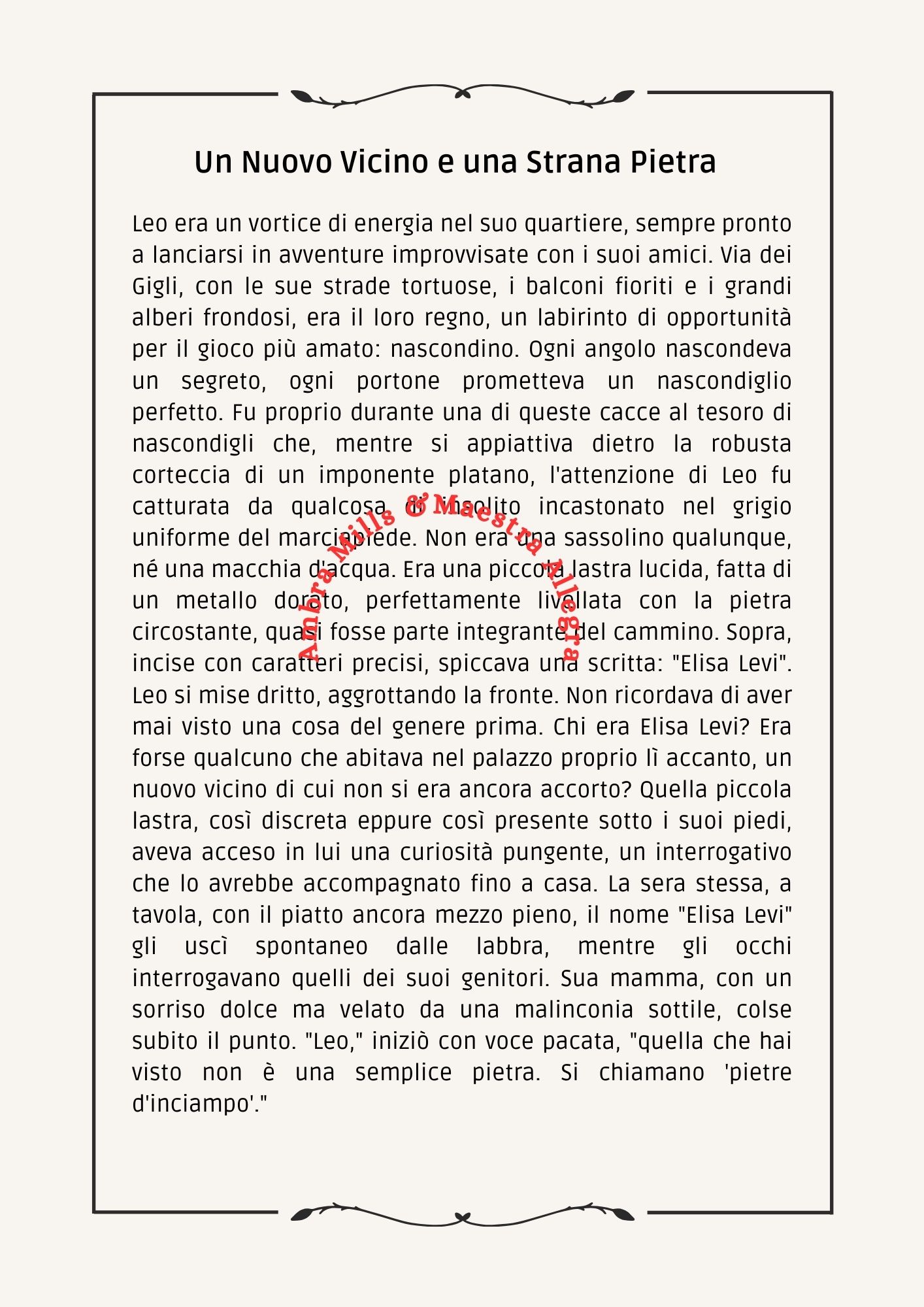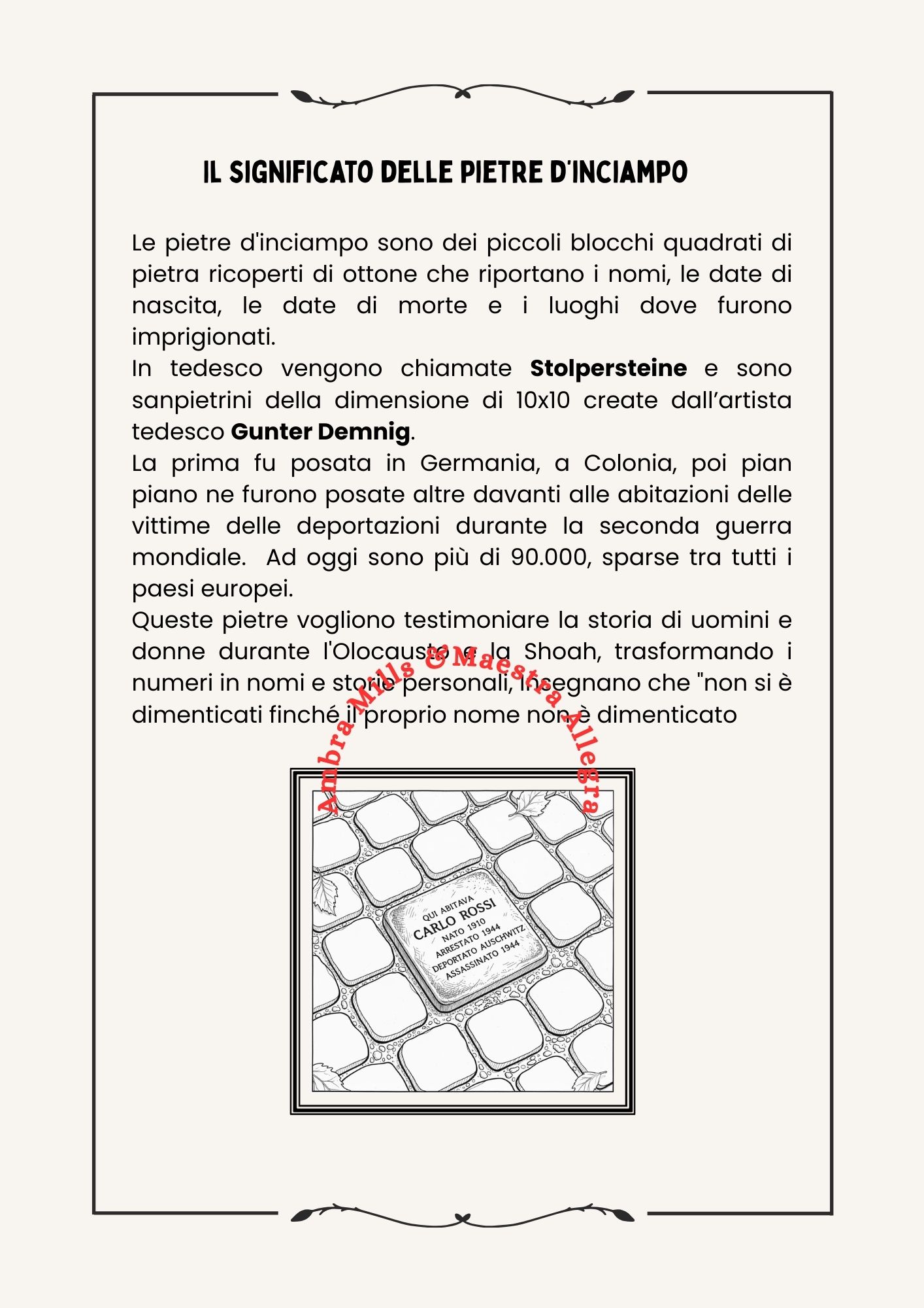 “Le pietre parlanti di Via dei Gigli” è una storia illustrata pensata per gli studenti di quarta e quinta primaria. Racconta la Shoah attraverso gli occhi di Leo, che scopre una Pietra d’inciampo dedicata a Elisa Levi. Il racconto, commovente e facilmente comprensibile, spiega il significato delle Stolpersteine e il loro ruolo nel preservare la memoria collettiva.
