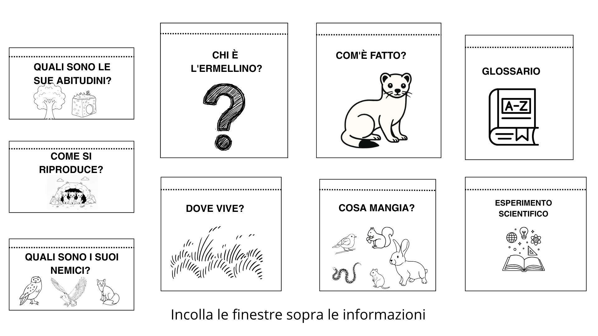 - Schede informative dettagliate: Testi chiari e concisi su dove vive l’ermellino, cosa mangia, come si riproduce, le sue abitudini e le sue caratteristiche fisiche uniche.