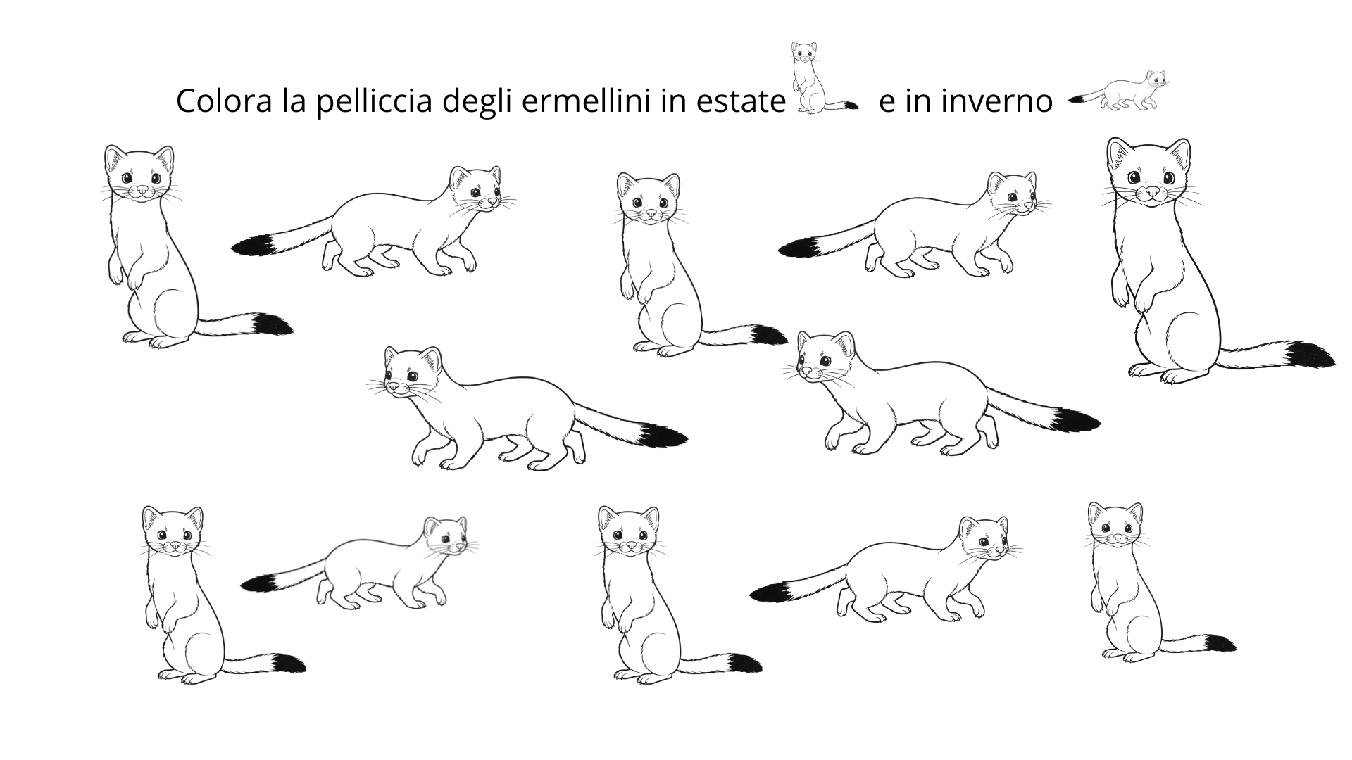 - Pagine da colorare: Attività creative per colorare l’ermellino nelle sue diverse livree estive e invernali, rinforzando la comprensione del suo adattamento stagionale.