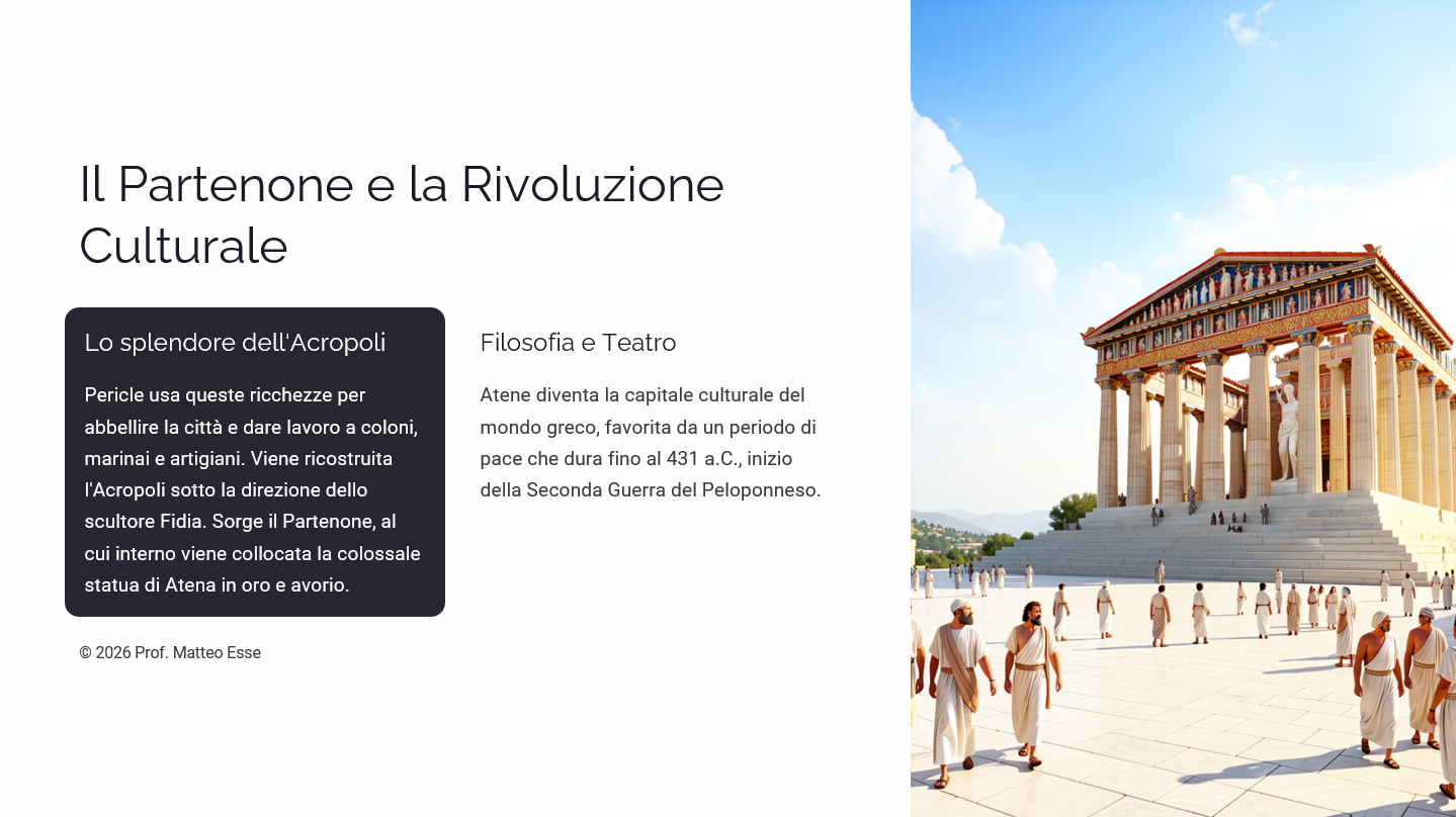 Porta in classe il “secolo d’oro” di Atene con una risorsa pronta all’uso e scientificamente rigorosa. Questa presentazione analizza l’ascesa di Pericle e la trasformazione di Atene in una potenza egemone, senza trascurare le contraddizioni del sistema democratico antico.