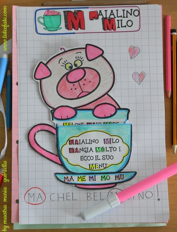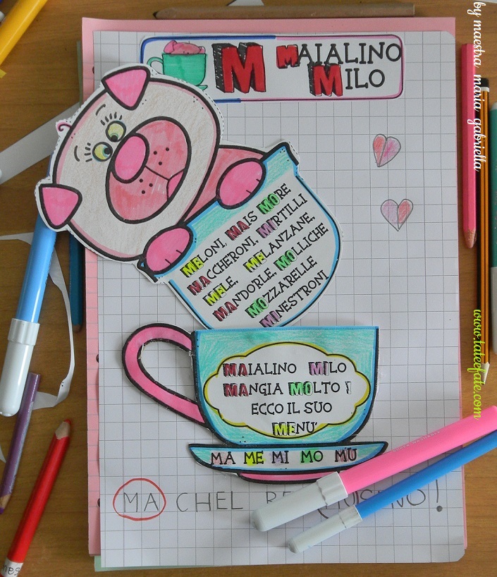 schede didattiche interattive sulla consonante M con soggetto Maialino e testo