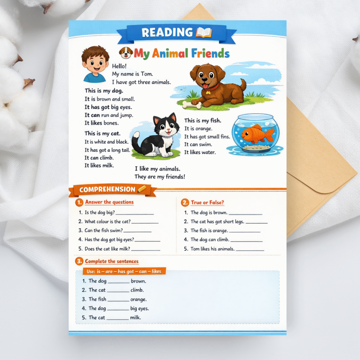 • Reading Literacy: Il brano “My Animal Friends” introduce Tom e i suoi tre compagni d’avventura (un cane, un gatto e un pesce) con un linguaggio semplice e descrizioni vivaci.