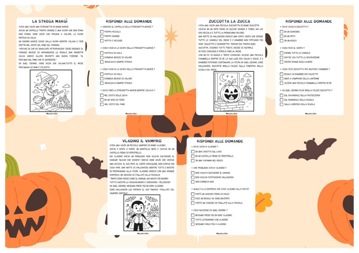 Tre divertenti letture di Halloween in stampato maiuscolo con comprensione del testo e disegno da colorare