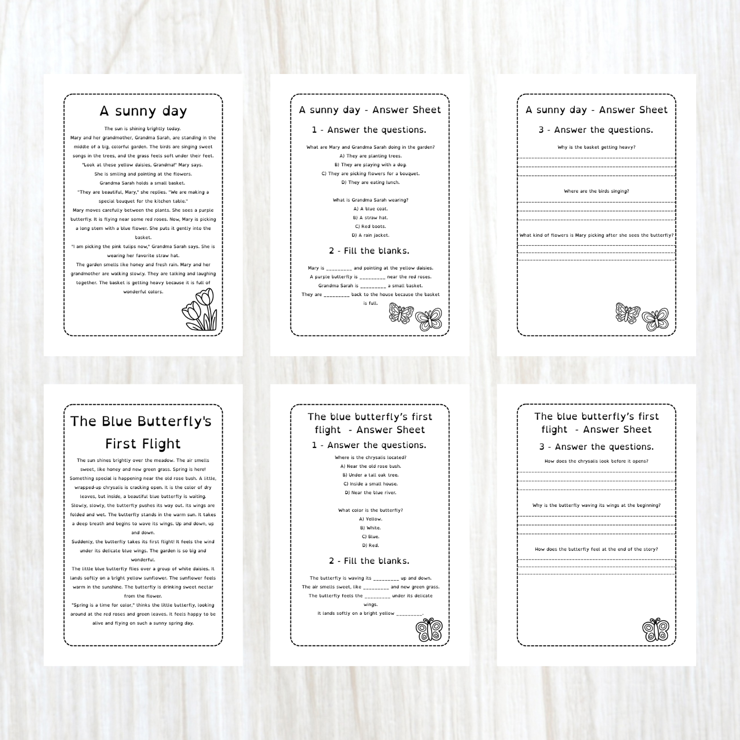 Lettura e Comprensione: due racconti originali (“A Sunny Day” e “The Blue Butterfly’s First Flight”) accompagnati da esercizi mirati (scelta multipla, completamento e domande aperte).