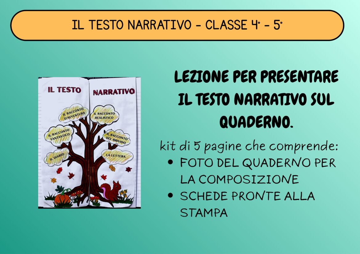 La “TESTO NARRATIVO – CLASSE 4° – 5°” presenta sul quaderno le le caratteristiche fondamentali del testo narrativo, in modo creativo e divertente.