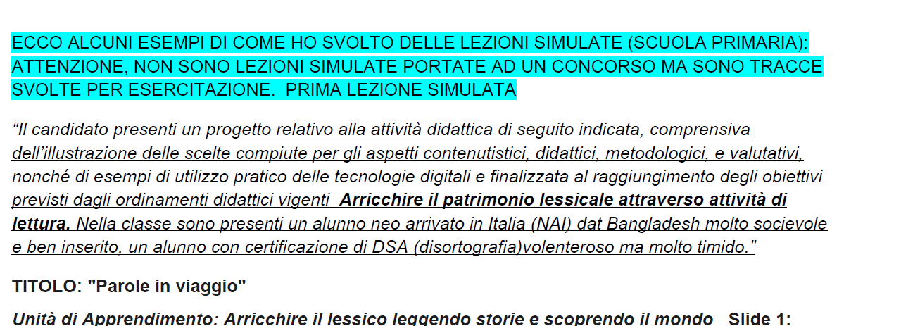 INFINE 5 ESEMPI DI LEZIONI SIMULATE (SCUOLA PRIMARIA): ATTENZIONE, NON SONO LEZIONI SIMULATE PORTATE AD UN CONCORSO MA SONO TRACCE SVOLTE PER ESERCITAZIONE