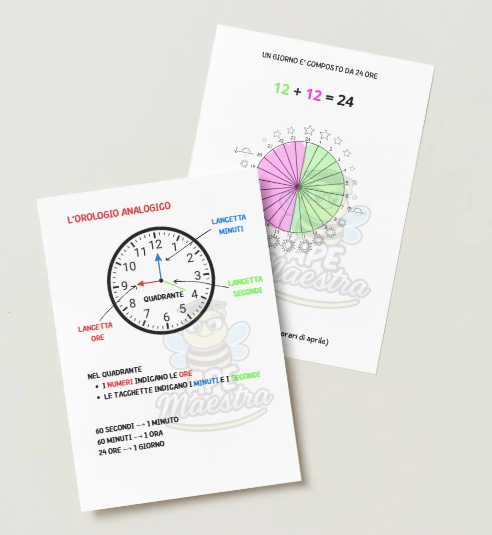 ATTENZIONE: l’immagine dell’anteprima è solo un esempio di utilizzo dei materiali che troverai. Le scritte sono tutte da far scrivere ai bambini e l’orologio è da completare a mano disegnando le lancette e scrivendo “quadrante”.