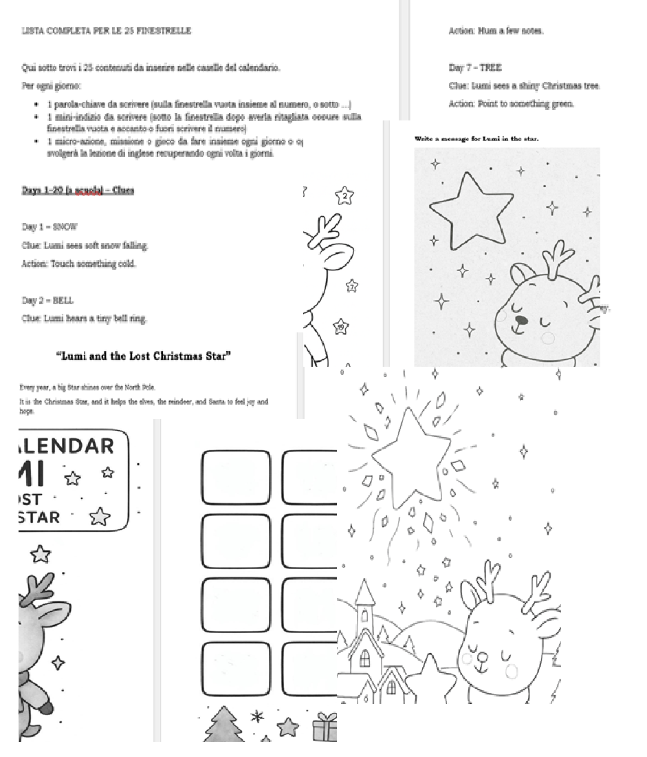Non è un calendario classico, non aspettatevi di trovare disegni da colorare o finestrelle che si aprono; in realtà lascia, volutamente, molto spazio all’immaginazione e alla creatività dei bambini e …. dei docenti! Ogni singola clue porta a semplici Actions che potranno far volare eventualmente la vostra fantasia… integrate e ampliate come meglio credete (molte son basate anche sul movimento, su micro azioni, gesti affettuosi e parole gentili e potete eventualmente anche usare dei video con delle canzoni o ampliare il lessico e stimolare la conversazione…saprete voi!)