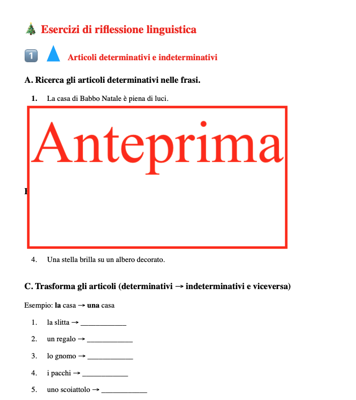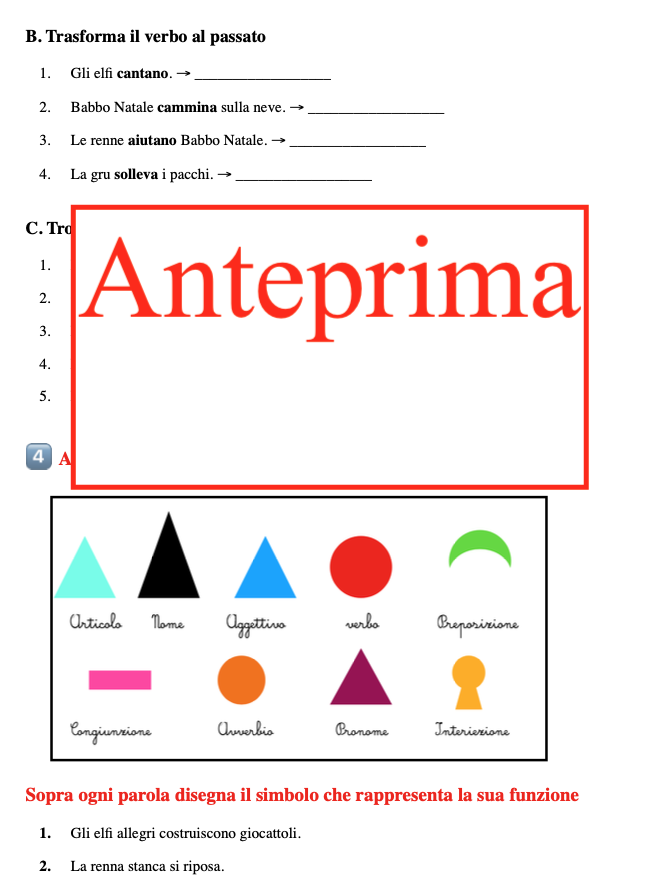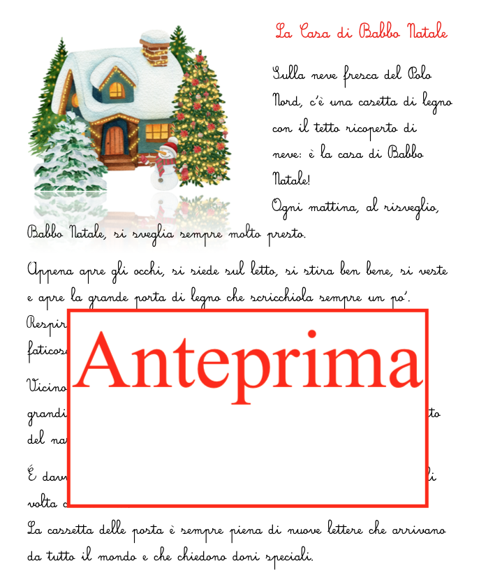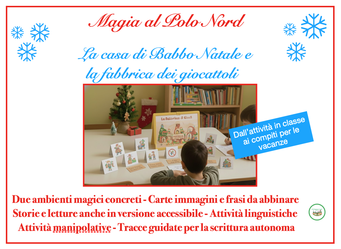 🎄 “La casa di Babbo Natale e la fabbrica dei giocattoli” – Pack didattico natalizio 🎄 Un viaggio educativo e creativo nel cuore del Natale! Un pack che propone un approccio concreto e giocoso per esplorare due mondi magici: la casa di Babbo Natale e la fabbrica dei giocattoli, trasformando l’apprendimento in un’esperienza coinvolgente e multisensoriale. ✨ Cosa contiene il pack: Disegni dettagliati dei due ambienti: la casa accogliente di Babbo Natale e la vivace fabbrica dei giocattoli. Questi scenari diventano concreti grazie ai cartellini-immagine, da leggere, abbinare e posizionare, per un gioco educativo che stimola osservazione e memoria. Letture con domande di comprensione: disponibili in due versioni, narrativa e facilitata, adatte a tutte le abilità di lettura e comprensione. Schede guida per la descrizione autonoma degli ambienti: due schede con traccia e domande stimolano i bambini a raccontare con le proprie parole la magia della casa e della fabbrica, promuovendo autonomia linguistica e creatività. Attività di riflessione linguistica: da svolgere in stile Montessori con simboli o nella versione tradizionale, per approfondire la grammatica e il linguaggio in modo divertente e pratico. 💡 Versatilità e utilizzo: Tutte le schede, le letture e le attività di riflessione linguistica possono essere utilizzate in classe come percorso strutturato, oppure a casa come compiti delle vacanze, permettendo a ogni bambino di esplorare il Natale secondo i propri tempi e interessi. 🎁 Con questo pack i bambini: Sperimentano l’apprendimento concreto e multisensoriale. Sviluppano competenze di lettura, comprensione e linguaggio. Allenano l’osservazione, la memoria e la capacità di descrizione. Vivono la magia del Natale attraverso il gioco educativo e la creatività.