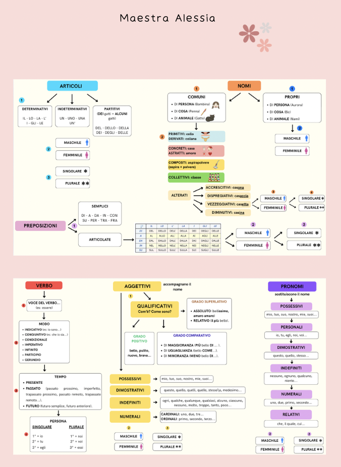 Questa è una mappa che ho costruito come strumento compensativo per una bambina di 4 elementare. Comprende: nomi, aggettivi, articoli, preposizioni, verbi e pronomi.
