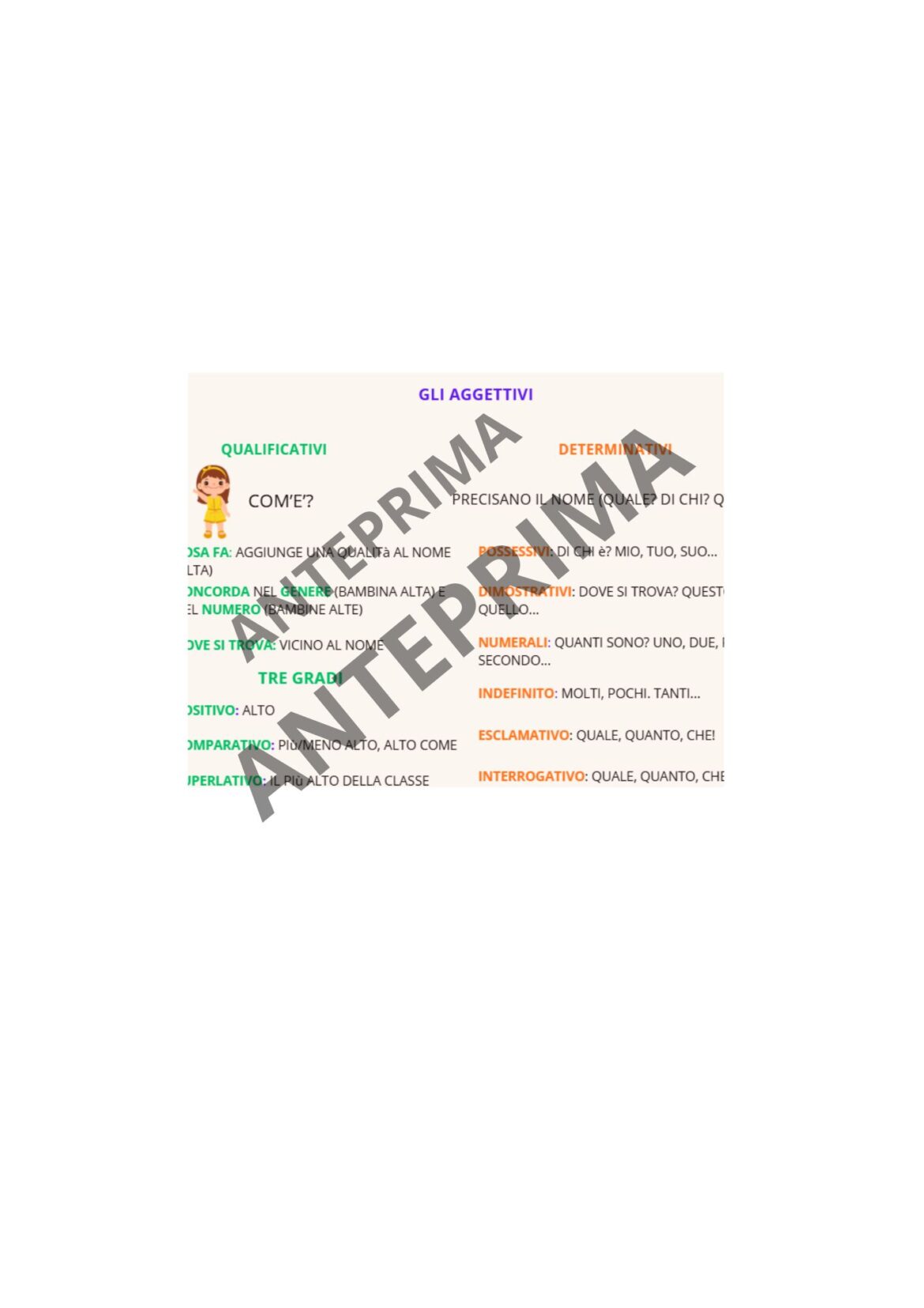 Uno schema visivo che organizza tutte le categorie di aggettivi (Qualificativi, Possessivi, Dimostrativi, Numerali, Indefiniti, Interrogativi ed Esclamativi). La mappa aiuta il bambino a orientarsi tra le diverse funzioni e a rispondere alle domande chiave (Com’è? Di chi? Quanti?).