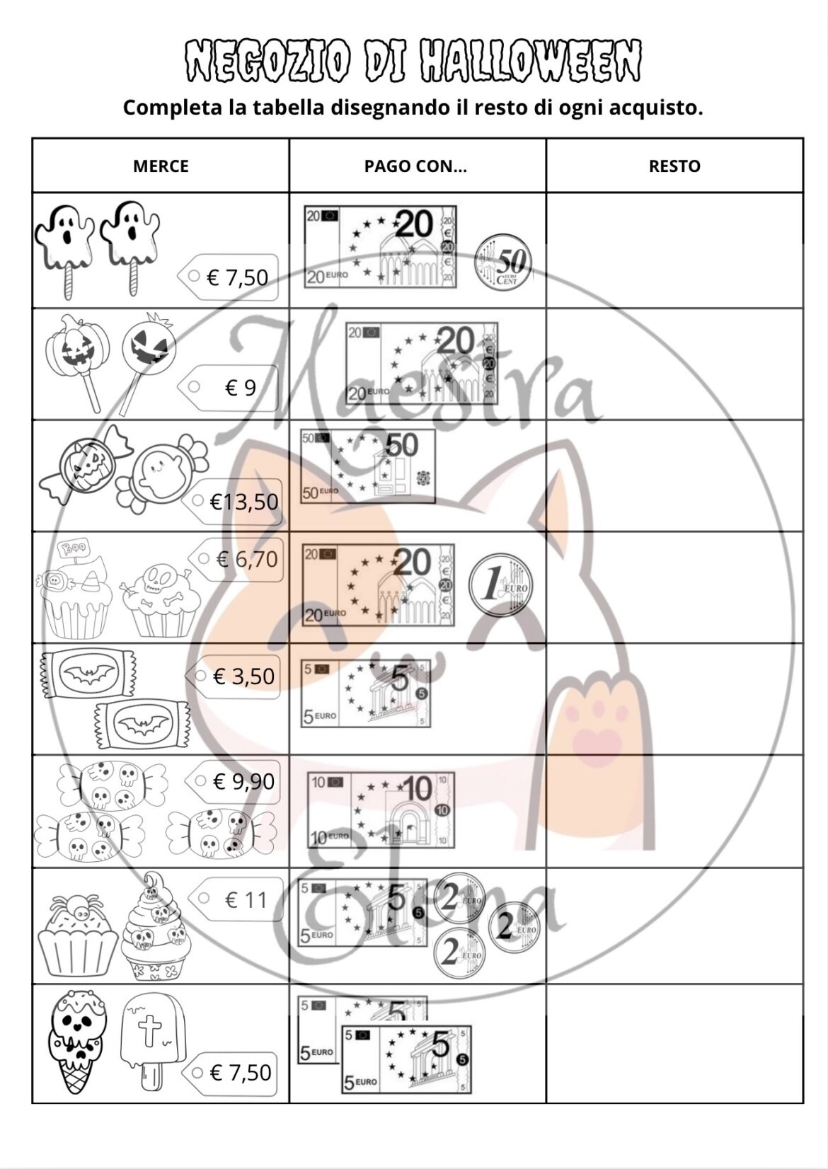 Attività didattica volta ad allenare il calcolo con gli Euro. La prima attività può essere svolta individualmente o in gruppo dai bambini, si richiede di calcolare il prezzo totale dei dolcetti e il resto dovuto. La seconda attività comprende le successive due pagine e viene svolta con un role playing: l’insegnante o un alunno a turno svolge il ruolo del negoziante e la classe a turno sceglie cosa comprare. Ad ogni bambino viene data una precisa somma (ad esempio €20 o €50) e in base alla spesa calcoleranno il totale e il resto corretto. Queste due pagine servono per tenere traccia dell’attività sul quaderno. Consiglio di stampare l’ultima pagina in un foglio A3.