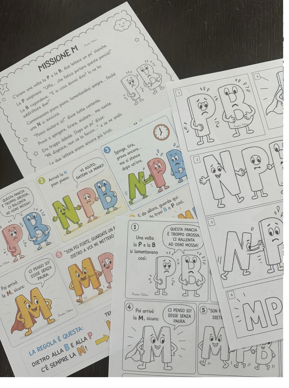 Una storia a fumetti colorata e super coinvolgente: le lettere P, B, N e M prendono vita per spiegare la regola in modo giocoso e memorabile.