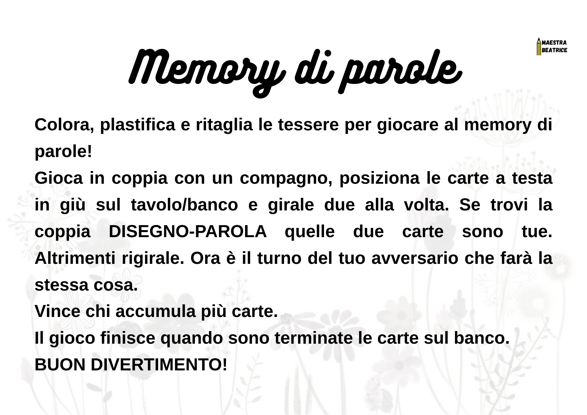 Troverete 16 tessere DISEGNO e 16 tessere PAROLA con cui creare le coppie.