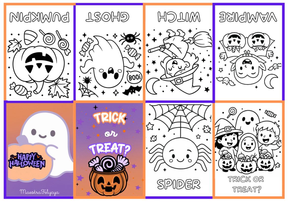 Realizzato da Maestra Felycya, questo colouring book introduce i principali personaggi di Halloween – la zucca, il fantasma, la strega, il vampiro, i bambini con le caramelle e il ragno – attraverso illustrazioni semplici, vivaci e perfette per stimolare la creatività.