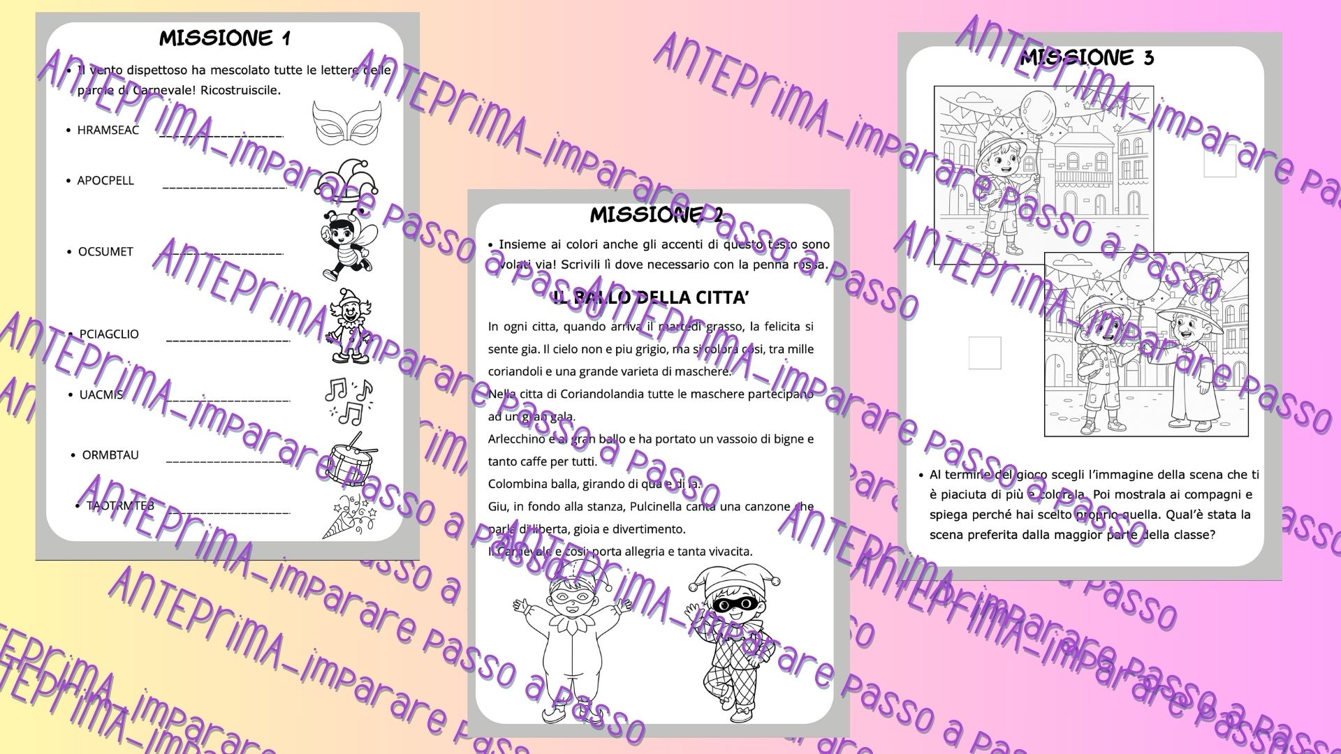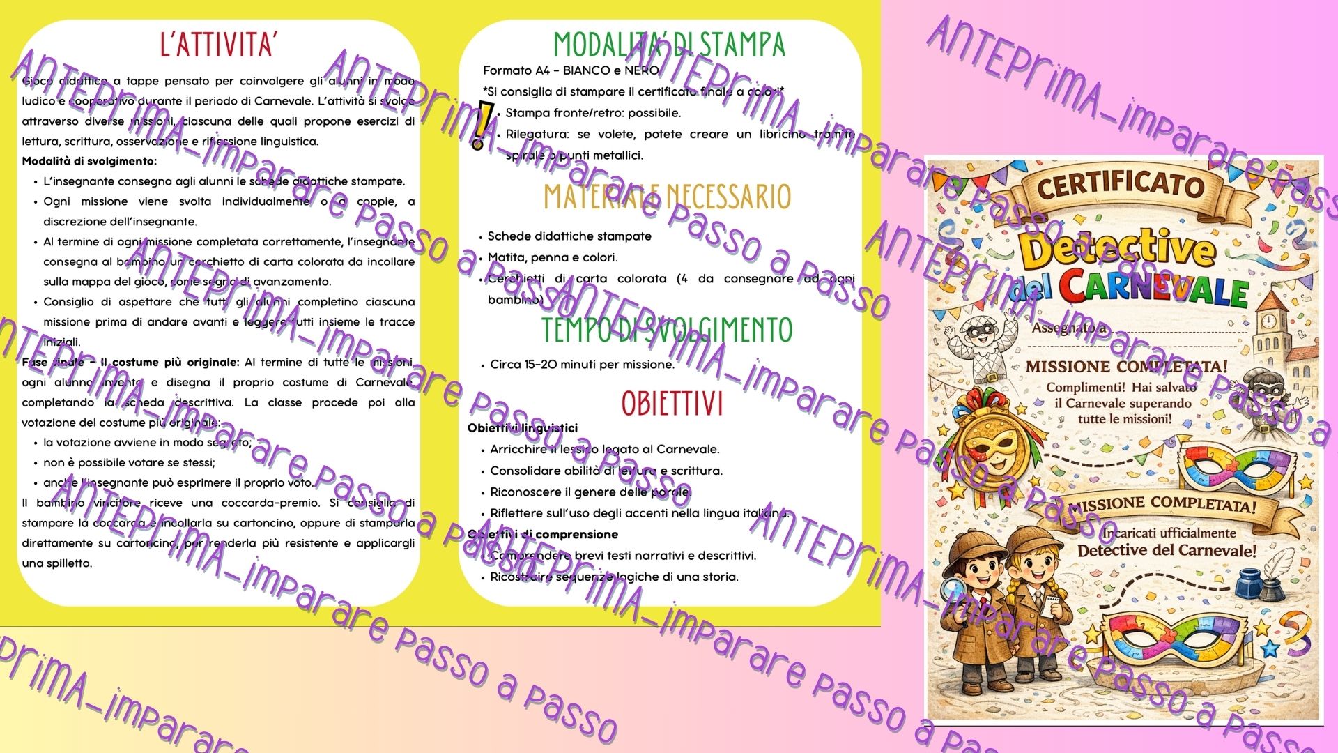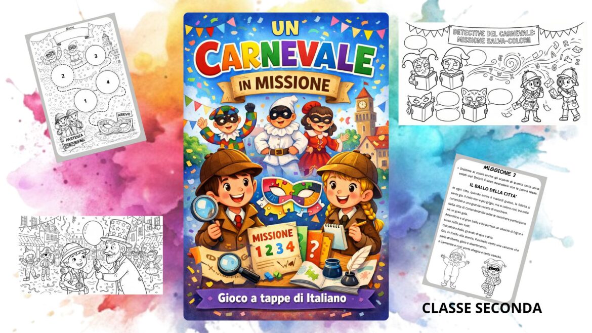 Missione di Carnevale: gioco didattico a tappe di italiano – Classe seconda primaria Un vento dispettoso ha rubato parole, colori e storie… 🌪️🎨 Solo i veri Detective del Carnevale riusciranno a completare tutte le missioni e a salvare la festa! 🎉 👉 gioco didattico coinvolgente e cooperativo, pensato per rendere l’apprendimento divertente durante il periodo di Carnevale, attraverso sfide di lettura, scrittura, logica e creatività. 🗺️ COME FUNZIONA Gli alunni affrontano 4 missioni progressive, da svolgere individualmente o a coppie 👯♂️ Al termine di ogni missione completata, ricevono un cerchietto colorato da incollare sulla mappa del gioco 📍✨ La classe avanza insieme, mantenendo alta la motivazione e il coinvolgimento! 🧠 COSA CONTIENE ✔️ Giochi di parole e anagrammi ✔️ Comprensione e completamento di testi ✔️ Attività su genere delle parole e accenti ✔️ Riordino logico di una storia 📖 ✔️ Caccia alle parole a tema Carnevale 🔍 ✔️ Attività finale creativa: invenzione e disegno di un costume 🎭 ✔️ Votazione segreta del costume più originale con coccarda premio 🏅 🎯 OBIETTIVI DIDATTICI 📚 Arricchire il lessico del Carnevale ✍️ Consolidare lettura e scrittura 🧩 Sviluppare logica, attenzione e problem solving 🎨 Stimolare creatività ed espressione personale 🤝 Favorire collaborazione, rispetto delle regole e autovalutazione ⏱️ TEMPI DI SVOLGIMENTO 🕒 15–20 minuti PER missione 🎨 Attività finale creativa e votazione: circa 30 minuti ➡️ Tempo totale: circa 1 ora e 30 minuti – 2 ore 📑 Numero totale di pagine: 15 (incluse istruzioni e informazioni per il docente) Car* insegnante, questi file sono destinati esclusivamente all’uso personale e per il lavoro con le tue classi o i tuoi bambini. Qualsiasi condivisione o distribuzione a colleghi o altri soggetti causa una violazione del diritto dell’autore. Se ti è piaciuto, segui la mia pagina “Imparare passo a passo” per altre risorse a tema e molto altro! Grazie.