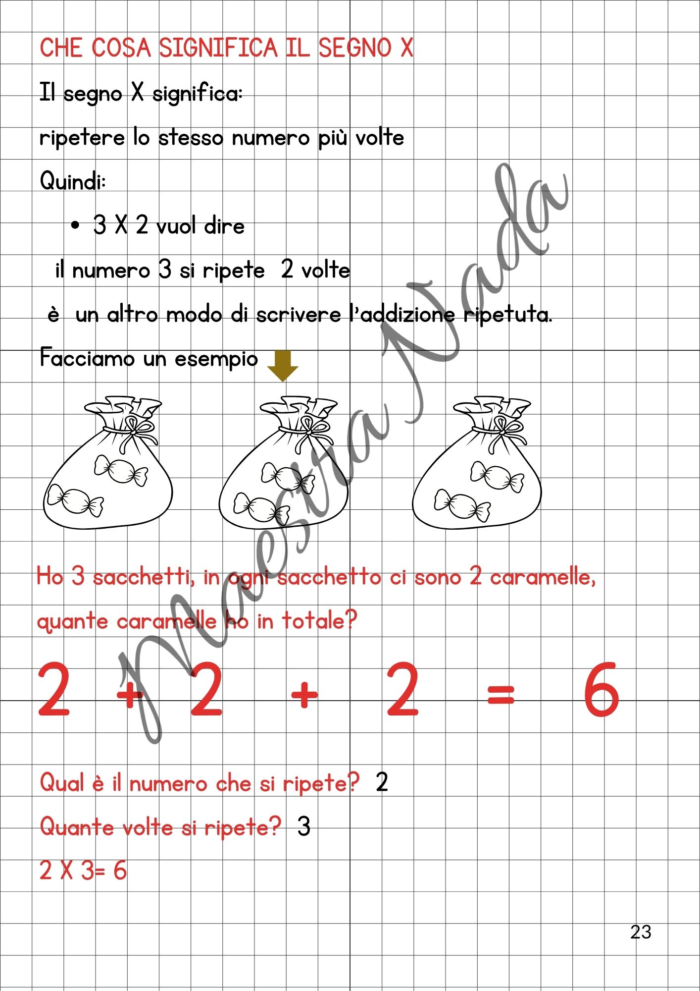 Attraverso numeri figurati, addizione ripetuta, incroci e schieramenti, gli alunni vengono guidati passo dopo passo verso la comprensione del significato della moltiplicazione, fino ad arrivare alle tabelline e alla tavola pitagorica.