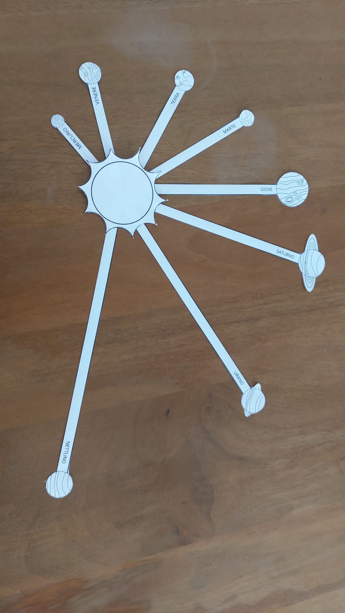 Modellino del sistema solare con il sole e gli 8 pianeti, da stampare, colorate, ritagliare e assemblare con l’aiuto di un fermacampione