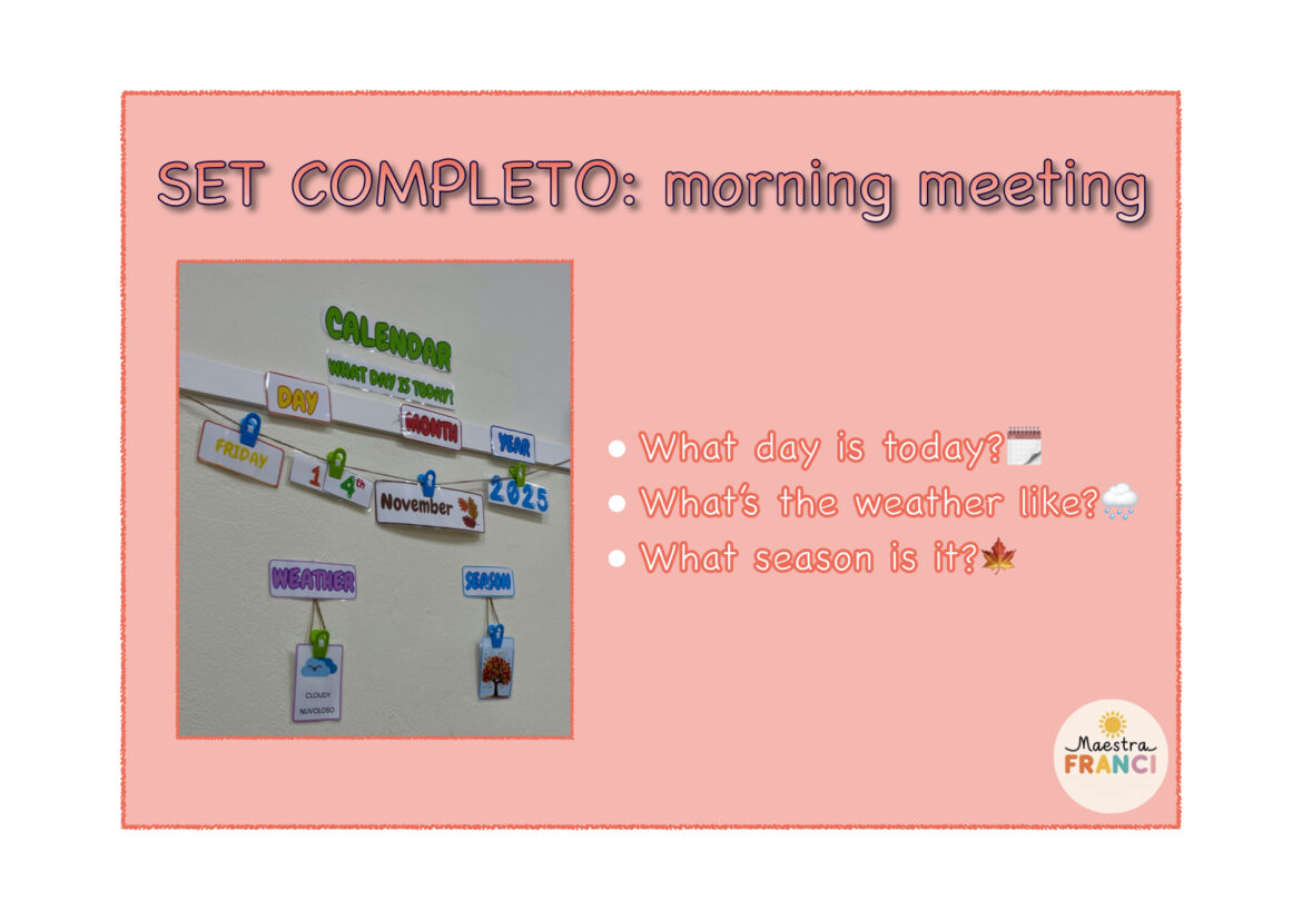 Rendi il morning meeting ancora più divertente con il Set Completo: What day is today? – What season is it? – What’s the weather like? 🌈📚✨