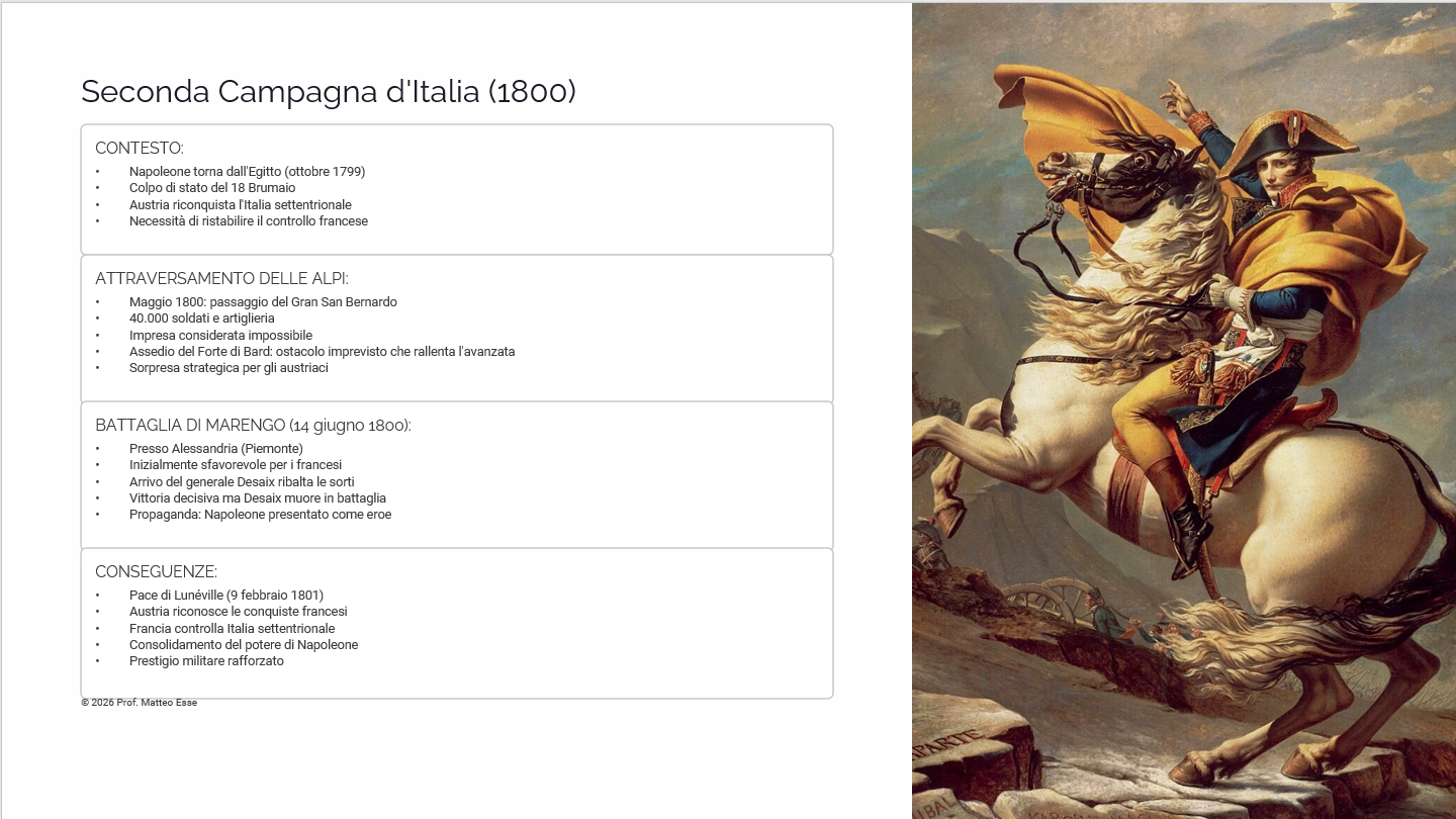 Questo kit didattico guida la classe dalle prime campagne militari di fine ‘700 fino alla proclamazione dell’Impero nel 1804. Non è una semplice cronologia, ma un’analisi profonda delle riforme (giuridiche, amministrative e scolastiche) che hanno segnato la storia europea. Il materiale è interamente modificabile (PPTX).