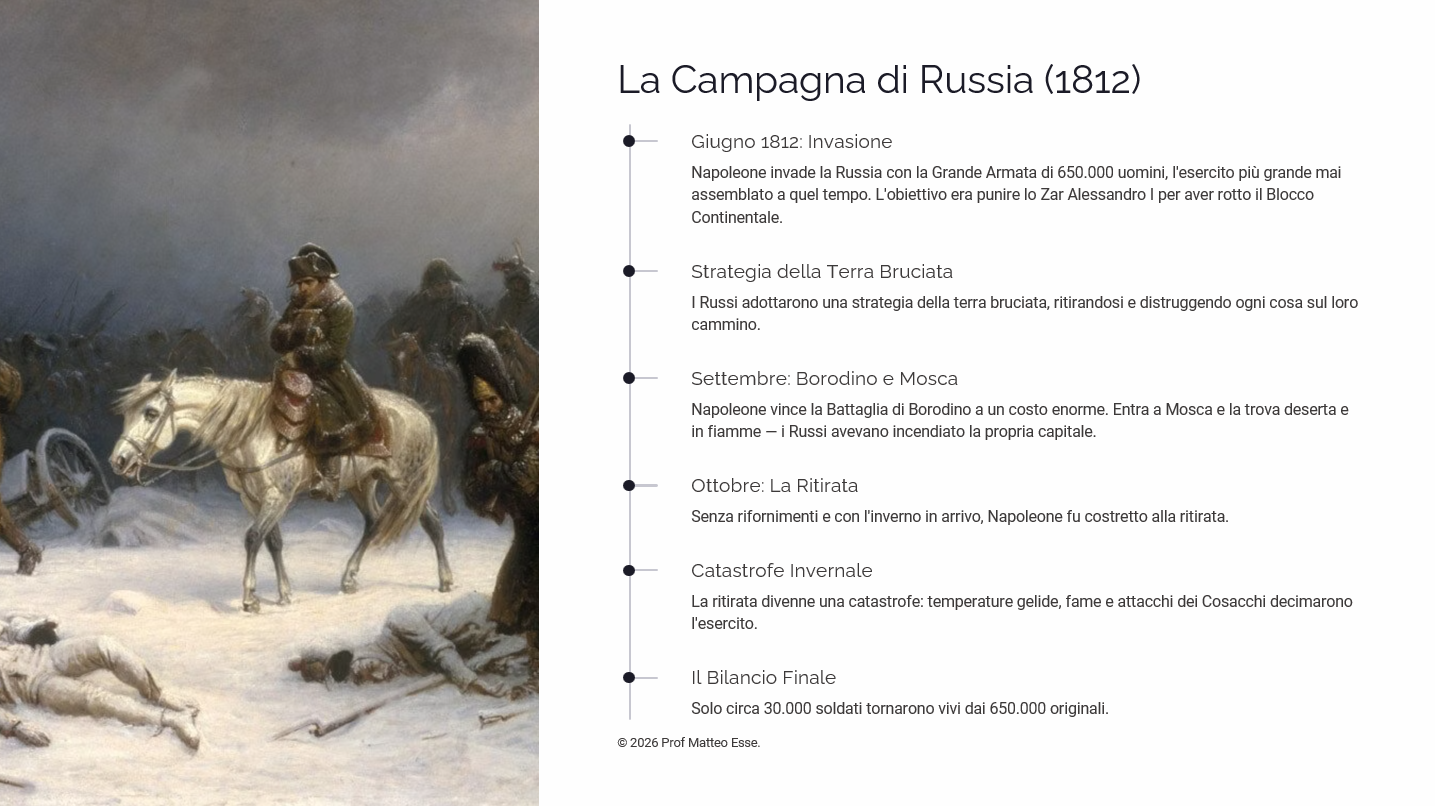 Concludi l’epopea napoleonica con una lezione strutturata sui fattori che portarono al crollo dell’Impero.