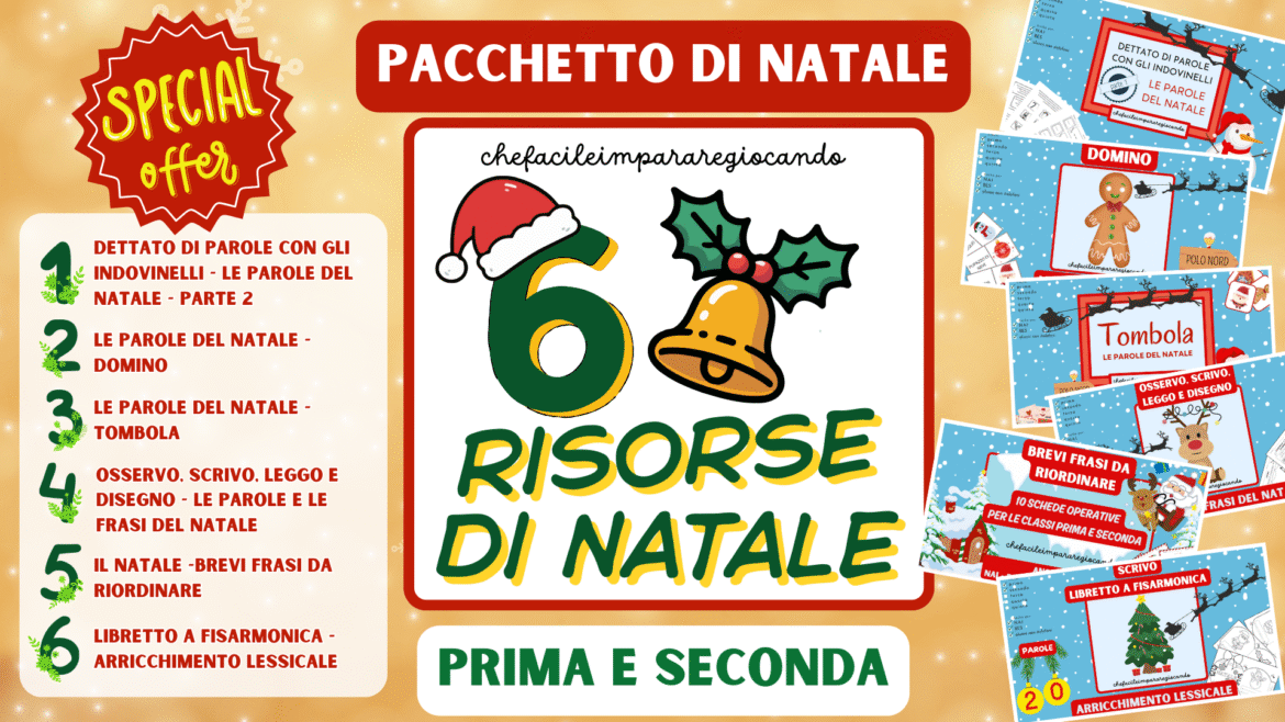 Porta la magia del Natale in classe (o a casa) con questo pacchetto di 6 attività già pronte, pensate per stimolare lettura, scrittura e arricchimento del vocabolario in modo semplice, divertente e immediato.