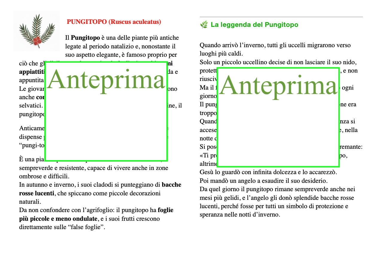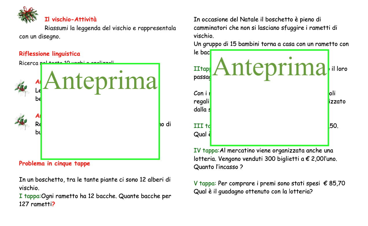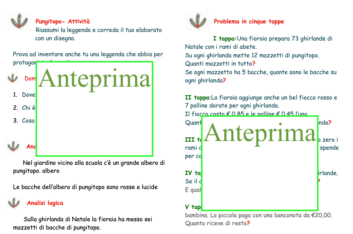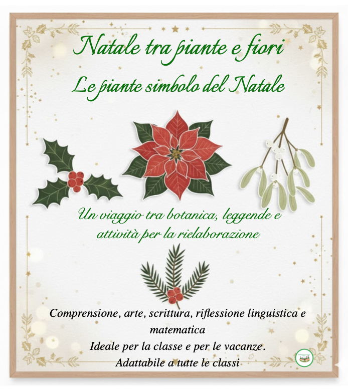 🌟 Natale Verde: Botanica, Leggende e Attività Multidisciplinari Un percorso originale che unisce scienza, tradizione e creatività, pensato per tutte le classi della Scuola Primaria, con attività adattabili in base all’età. Le leggende possono essere lette, illustrate, drammatizzate o reinventate, rendendo il materiale accessibile e coinvolgente per tutti. Perfetto sia come piccolo libro tematico da leggere e sfogliare, sia stampato come schede indipendenti per attività a stazioni. Un kit che trasforma le piante simbolo del Natale in un’occasione di apprendimento interdisciplinare dove botanica, tradizione e leggenda si intrecciano e dove linguaggio e matematica si fondono per dare vita a un’esperienza ricca e significativa. ✨ Perché Sceglierlo Un materiale flessibile, completo e pronto all’uso, progettato per adattarsi facilmente a ogni classe. Uso modulare: puoi proporlo come libricino completo oppure suddividerlo in sezioni, una per ogni pianta, per creare stazioni tematiche. Le attività di rielaborazione sono perfette anche come compiti delle vacanze: brevi, stimolanti e ben calibrate. Approccio multidisciplinare: botanica, leggende, comprensione del testo, riflessione linguistica e piccoli problemi matematici lavorano insieme in un percorso coerente. 🌲 Contenuti del Kit: 4 Moduli Tematici Ogni modulo è dedicato a una pianta del Natale e comprende botanica essenziale, una leggenda e attività di rielaborazione pensate per abilità diverse. 1. Stella di Natale (Poinsettia) Simbolo di festa e buon auspicio. Botanica: brattee rosse simili a petali e veri fiori gialli. Leggenda: il dono povero della piccola Ines che si trasforma nella “Flor de la Noche Buena”. 2. Pungitopo (Ruscus aculeatus) Sempreverde resistente, legato alla protezione della casa. Botanica: cladodi che fungono da foglie e bacche che crescono su di essi. Leggenda: un uccellino che vuole proteggere il suo nido riceve il dono del sempreverde. 3. Agrifoglio (Ilex aquifolium) Pianta robusta e spinosa, simbolo di speranza. Botanica: foglie coriacee, spine più fitte nella parte bassa, bacche invernali. Leggenda: il mito nordico di Baldur, simbolo di amore che supera il dolore. 4. Vischio Pianta sospesa e portafortuna. Botanica: semiparassita con bacche bianche e foglie carnose. Leggenda: le lacrime di un vecchio mercante che diventano perle di vischio. 🎁 Un Natale Educativo, Ricco di Significato Un kit completo, curato e immediatamente utilizzabile, ideale per chi vuole unire contenuti scientifici, narrazioni coinvolgenti e competenze trasversali. Trasforma le piante del Natale in un viaggio di scoperta: dalla botanica alle emozioni, dalle leggende ai numeri.
