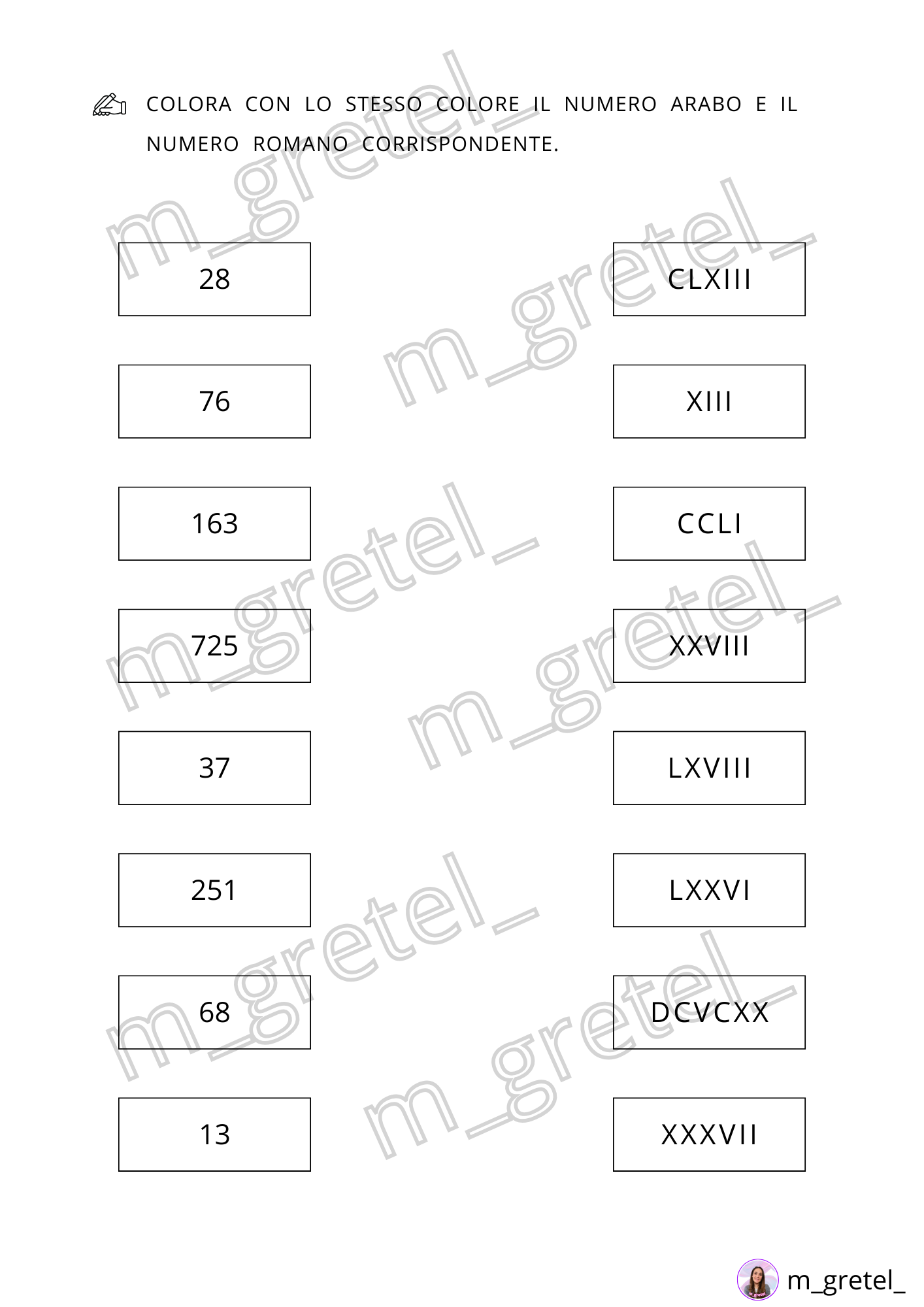 - Abbinamento numero in cifra (arabo) a numero romano corrispondente (1 esercizio);