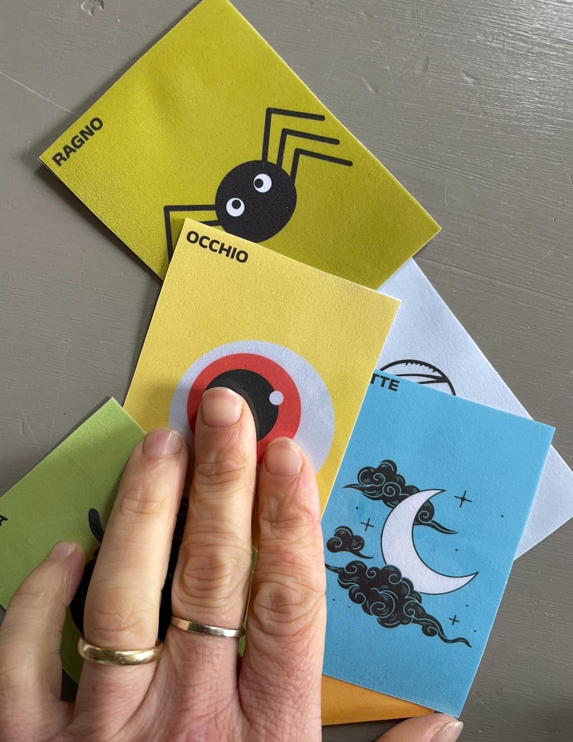 è un divertente party game che mette alla prova la tua rapidità e i tuoi riflessi! Questa versione riadattata in tema Halloween ti farà ridere e divertire a ogni partita. Il tuo obiettivo è liberarti delle carte il più velocemente possibile. I giocatori dovranno girare una carta alla volta pronunciando le parole “Occhio”, “Ragno”, “Gatto”, “Notte”, “Zucca”. Se la carta corrisponde alla parola detta, bisogna battere rapidamente la pila al centro. Se sbagli o sei l’ultimo a colpire, dovrai raccogliere tutte le carte. Le carte speciali come il Lupo, la Mummia, o la Zuppa, aggiungono ancora più divertimento al gioco. Perfetto per serate con amici o in famiglia, e per trascorrere una divertentissima e paurosa serata di Halloween.