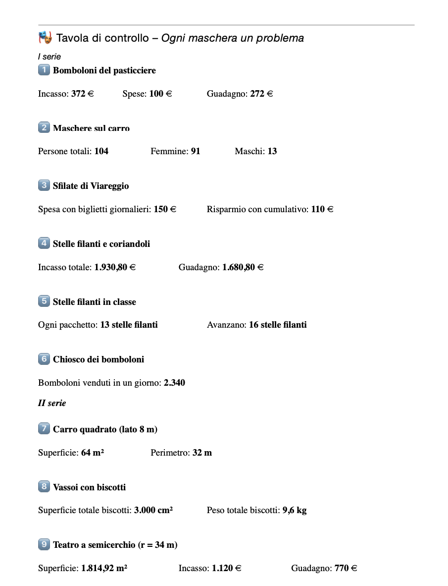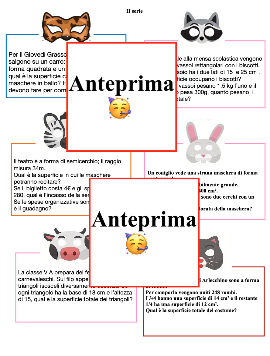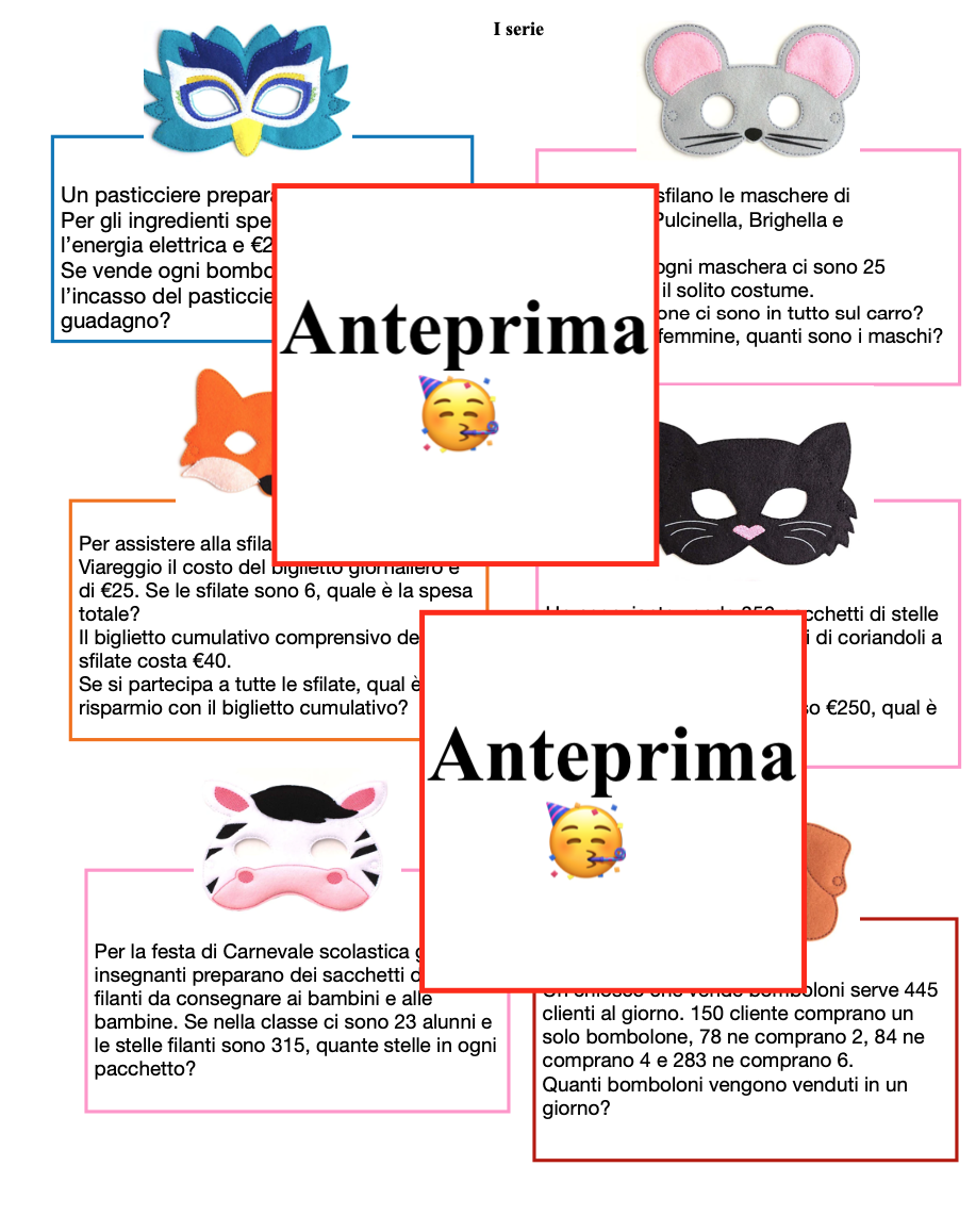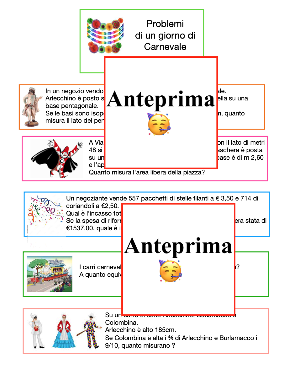 🎭 Ogni maschera un problema Il Carnevale entra in classe… e diventa matematica! Bomboloni, carri allegorici, maschere, piazze affollate e festoni colorati si trasformano in situazioni-problema coinvolgenti e realistiche. Una raccolta completa di problemi di aritmetica, geometria e misure pensata per la classe quarta e quinta primaria. Il materiale è strutturato in tre sezioni progressive e propone attività che allenano il problem solving, il calcolo con numeri naturali e decimali, l’uso delle frazioni, il peso lordo–netto–tara, le conversioni di misura e l’applicazione delle formule geometriche in contesti significativi. ✂ I problemi possono essere ritagliati e consegnati singolarmente. 👥 Ideali per lavoro individuale, a piccoli gruppi, a staffetta o a stazioni. 📝 Utilizzabili come percorso tematico, laboratorio matematico o verifica strutturata. 🔎 Completi di tavola di controllo per l’autocorrezione. Un modo diverso per consolidare competenze matematiche mantenendo alta la motivazione… perché ogni maschera porta con sé una sfida da risolvere! Materiale stampabile pronto all’uso; 12 pagine