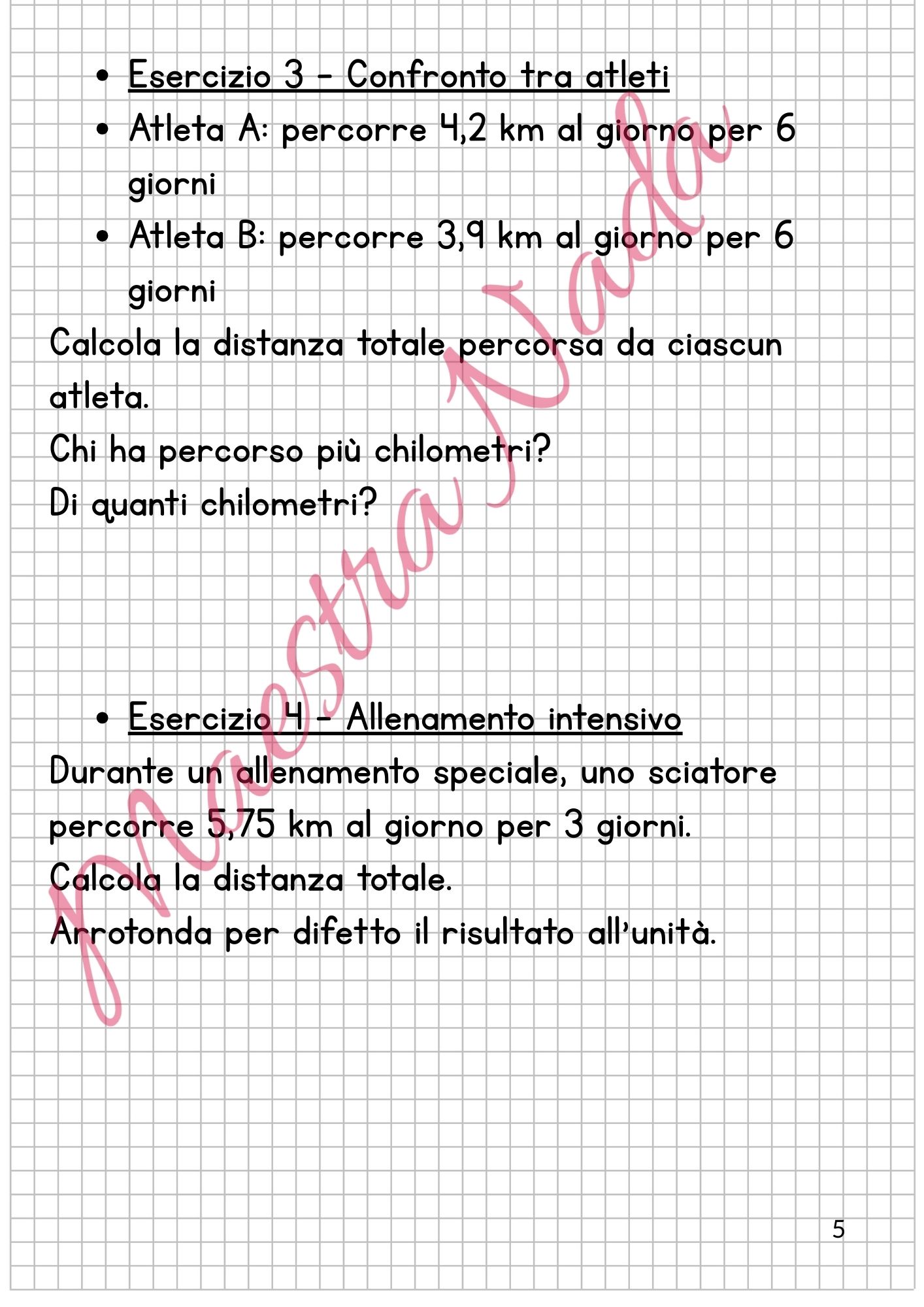 Il fascicolo include attività come quella sugli allenamenti degli atleti, con calcoli di distanze percorse, e schede di statistica in cui gli alunni analizzano sport praticati, numero di atleti e percentuali