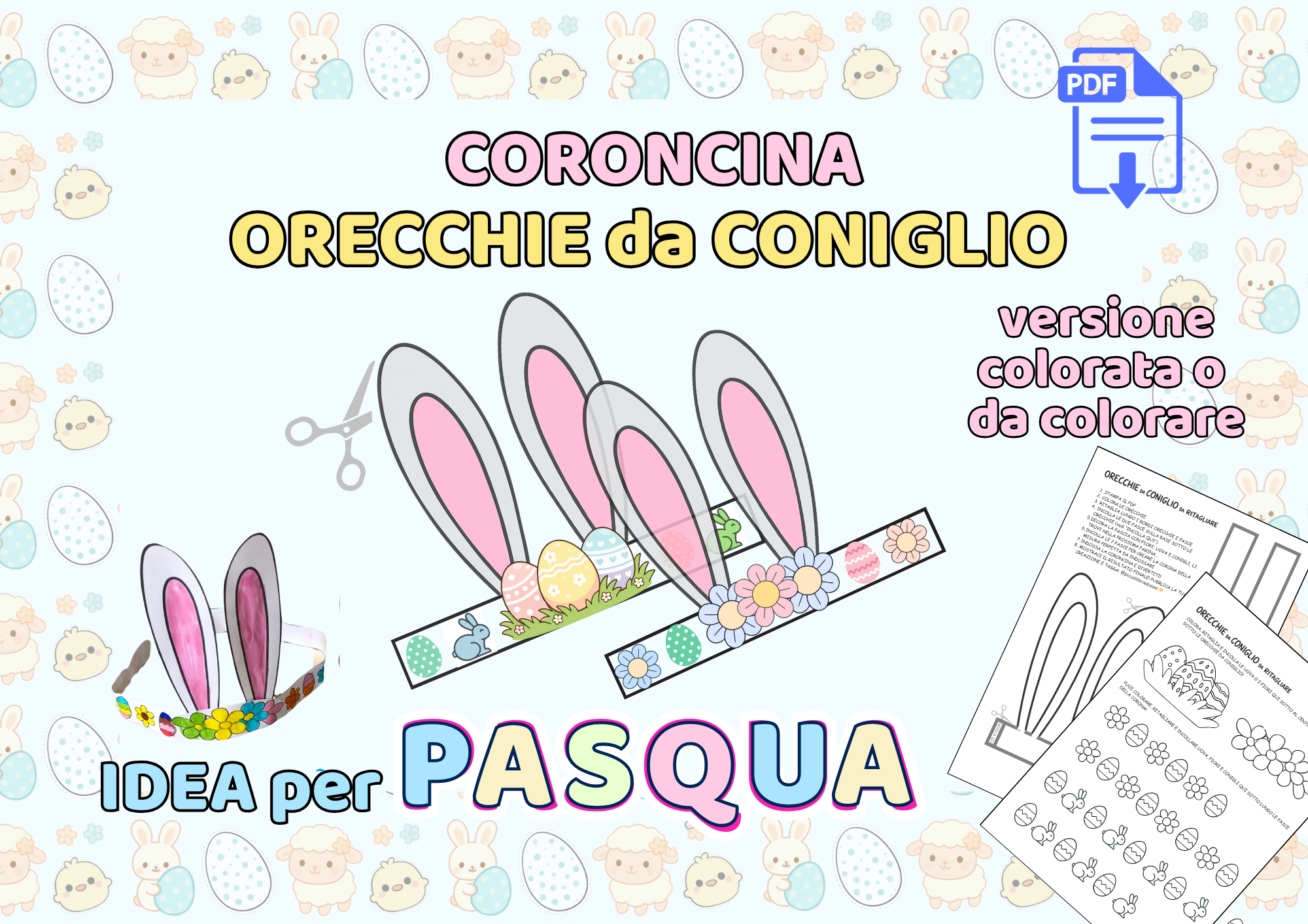 All’interno del PDF troverai delle coroncine con orecchie da coniglio da stampare e personalizzare con diverse decorazioni a tema pasquale, come uova, coniglietti e fiori.