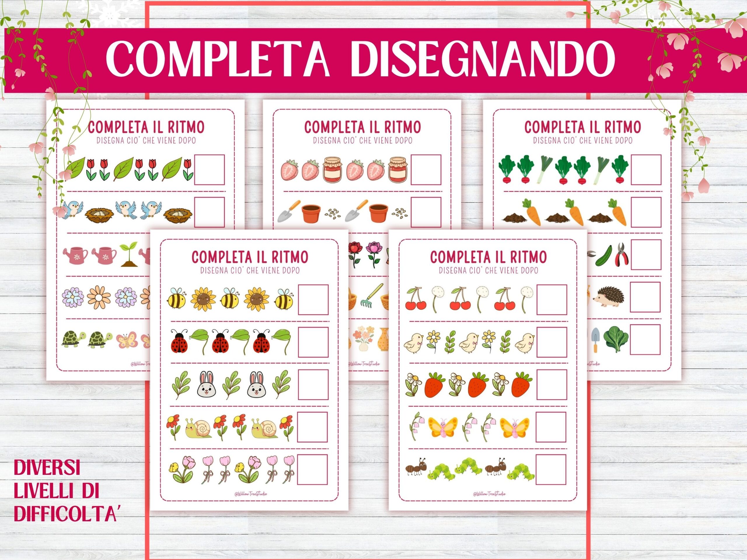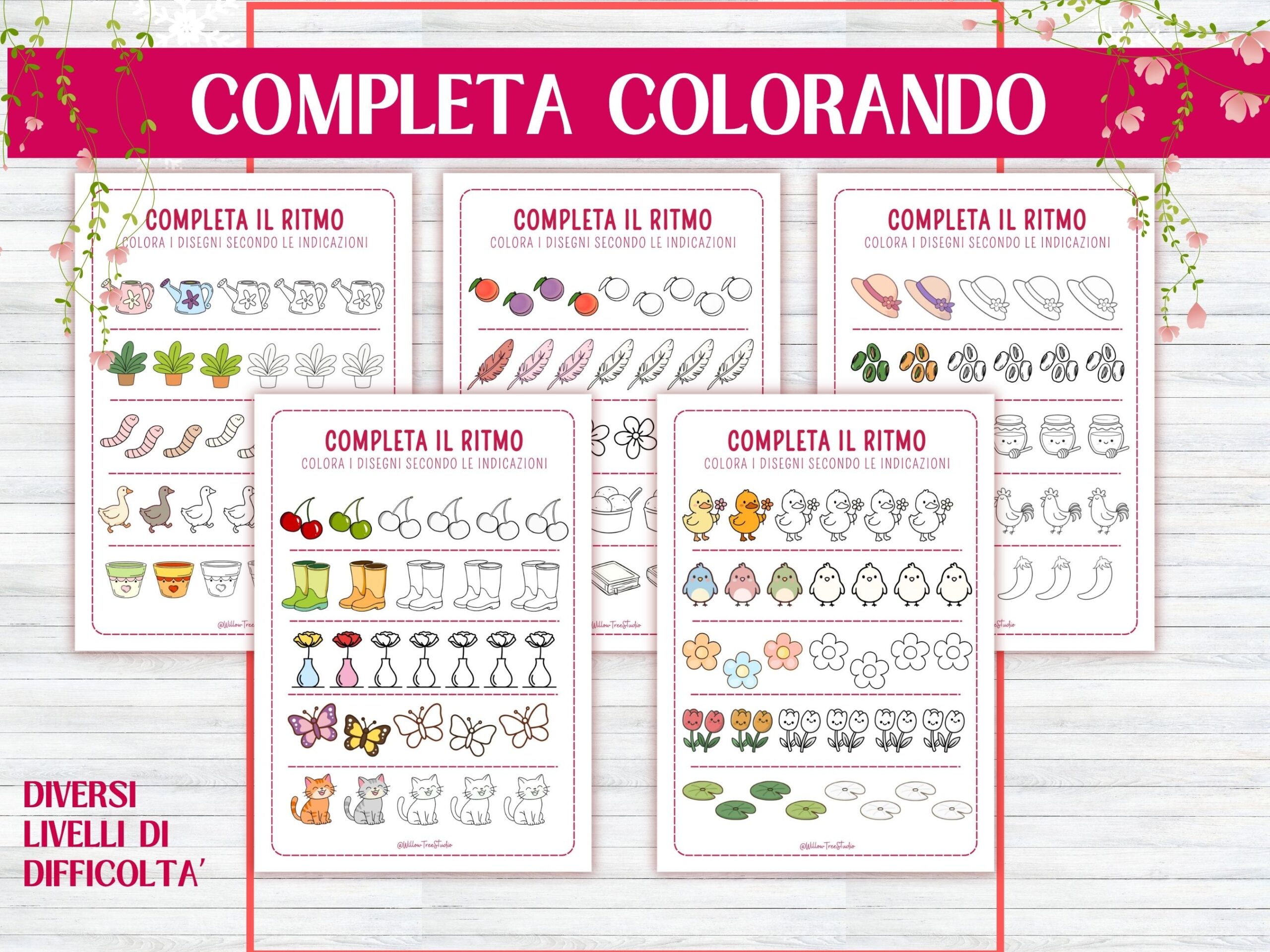 • Completa il ritmo colorando (5 schede) – colora gli oggetti rimanenti mantenendo il ritmo corretto.