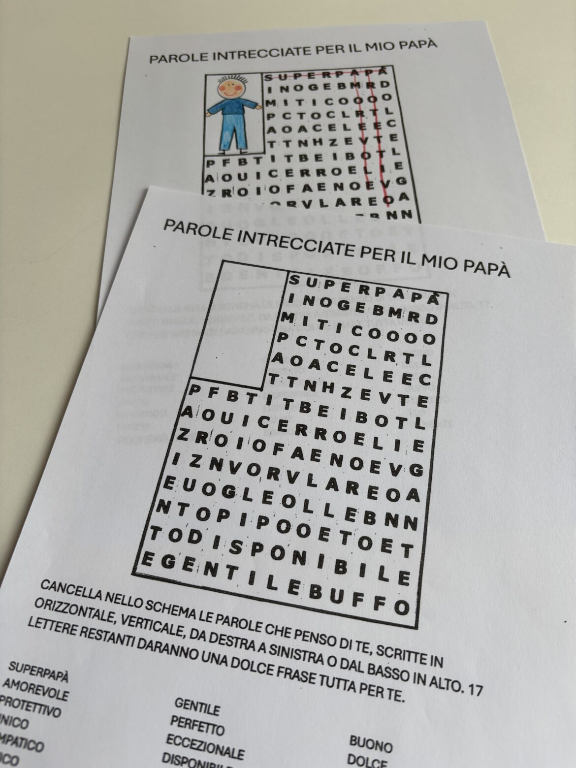 Un piccolo pensiero per la festa del papà. Parole intrecciate è un gioco che il papà dovrà risolvere trovando tutte le parole scritte in orizzontale, verticale, da destra a sinistra o dal basso in alto. 17 lettere restanti daranno una dolce frase per lui.