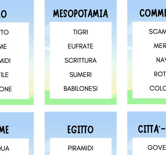 Carte per giocare a Tabù con le parole chiave delle civiltà studiate in classe quarta.