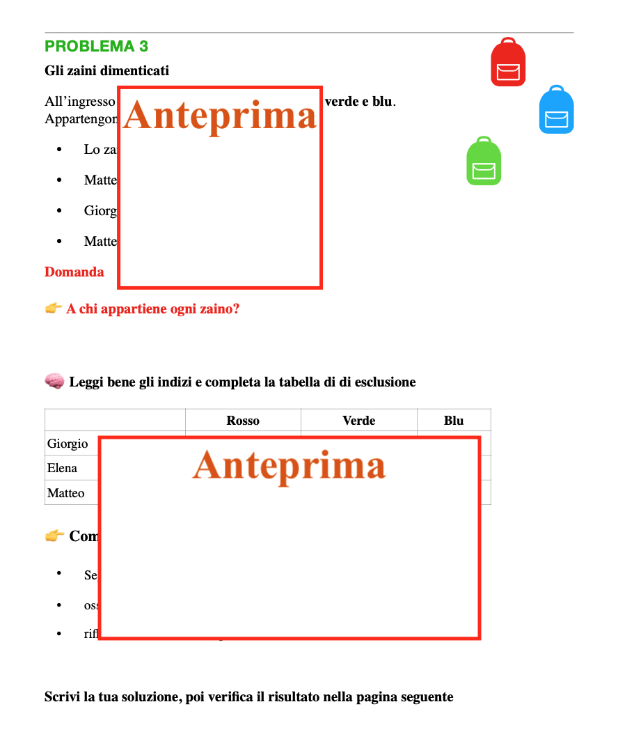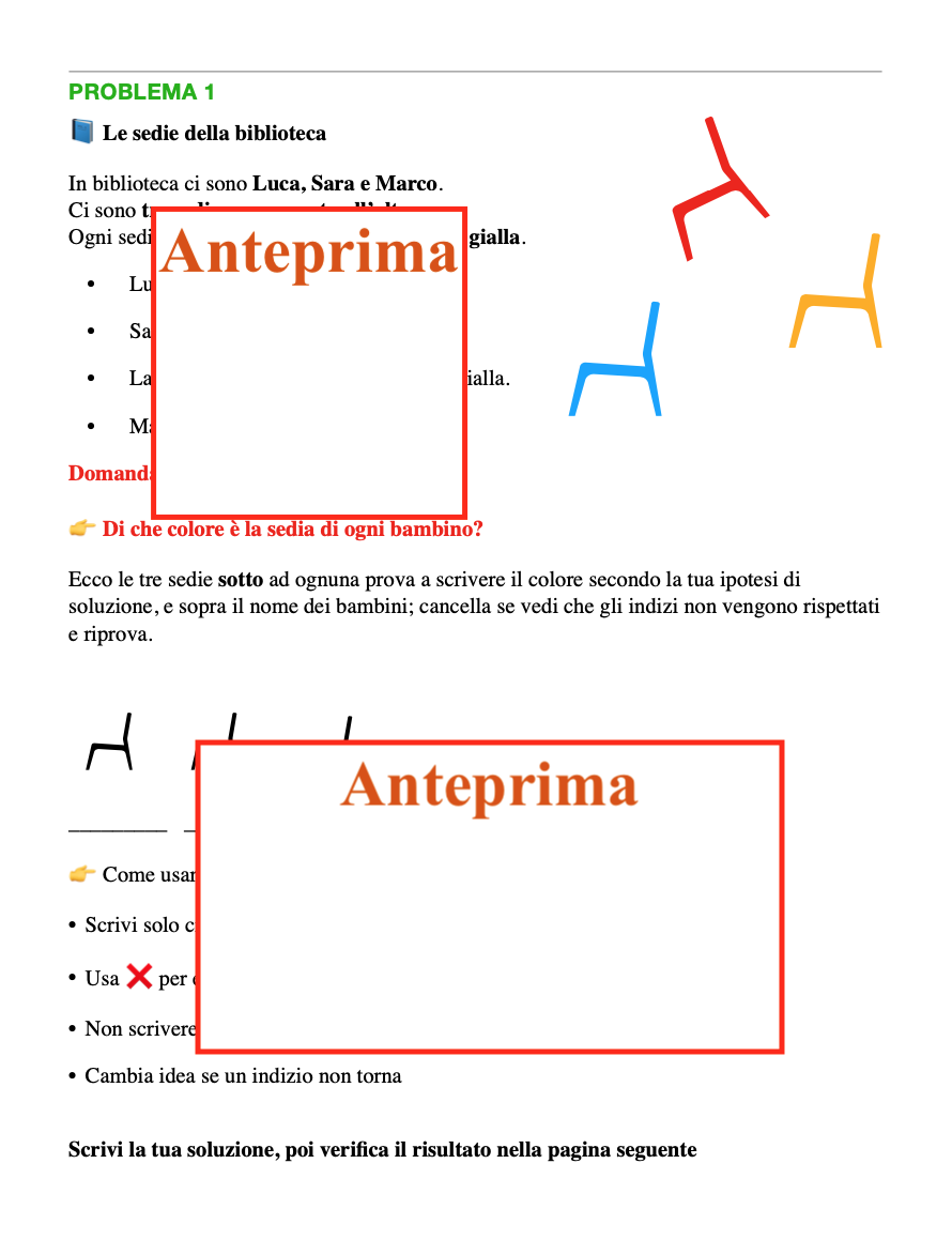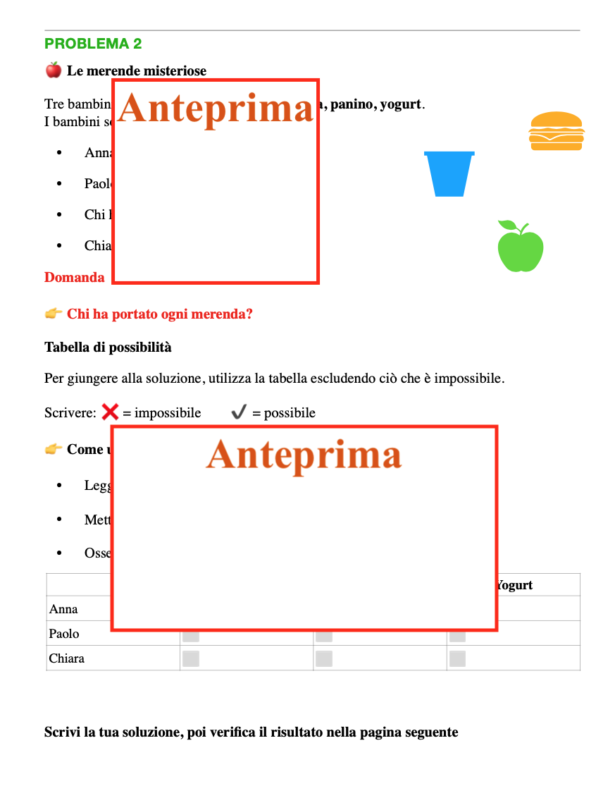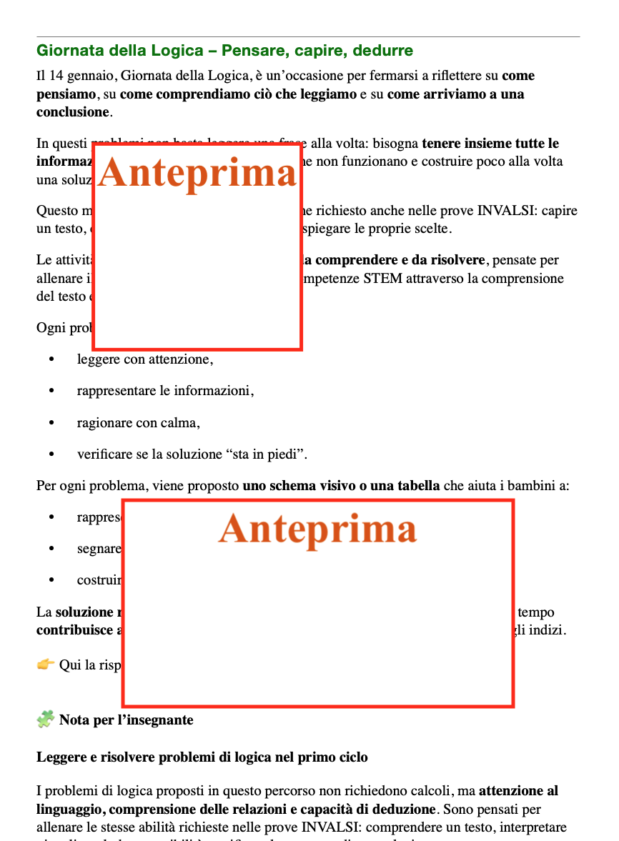 Questo materiale nasce per la Giornata della Logica, ma è pensato per essere utilizzato durante tutto l’anno scolastico, come allenamento quotidiano al pensiero. Le attività proposte non sono esercizi di calcolo né semplici giochi di logica, ma situazioni da comprendere e risolvere attraverso la lettura attenta degli indizi, il confronto delle informazioni e la verifica della coerenza della soluzione. Ogni problema accompagna i bambini a: -leggere con attenzione; -individuare vincoli e relazioni; -rappresentare le informazioni con schemi visivi e tabelle; -formulare ipotesi ed escludere quelle che non funzionano; -controllare se la soluzione è possibile Questo tipo di ragionamento è lo stesso richiesto nelle prove INVALSI: comprendere un testo, fare inferenze, usare i vincoli, verificare la risposta. Per questo il percorso è particolarmente adatto al primo ciclo della scuola primaria. 🧠 Logica, linguaggio e STEM Il percorso sviluppa competenze riconducibili all’area STEM, intese come pensiero prima ancora che come calcolo: uso di schemi e tabelle come strumenti di ragionamento; formulazione e verifica di ipotesi; controllo della coerenza logica; atteggiamento scientifico di prova, errore e revisione. 📊 Struttura del materiale Per ogni problema sono presenti: il testo con gli indizi; una tabella o uno schema visivo vuoto, da completare; una soluzione ragionata, pensata come tavola di controllo. La soluzione non serve solo a “dire la risposta giusta”, ma a dare ordine al ragionamento, aiutando i bambini a capire perché una soluzione funziona. 🌱 Valore educativo I bambini imparano che: non si risponde in fretta; ogni parola conta; una soluzione è corretta solo se rispetta tutti gli indizi; l’errore è un’ipotesi da rivedere, non un fallimento. 📌 Adatto a: classi del secondo ciclo della primaria Giornata della Logica preparazione alle prove INVALSI percorsi di logica, pensiero critico e STEM