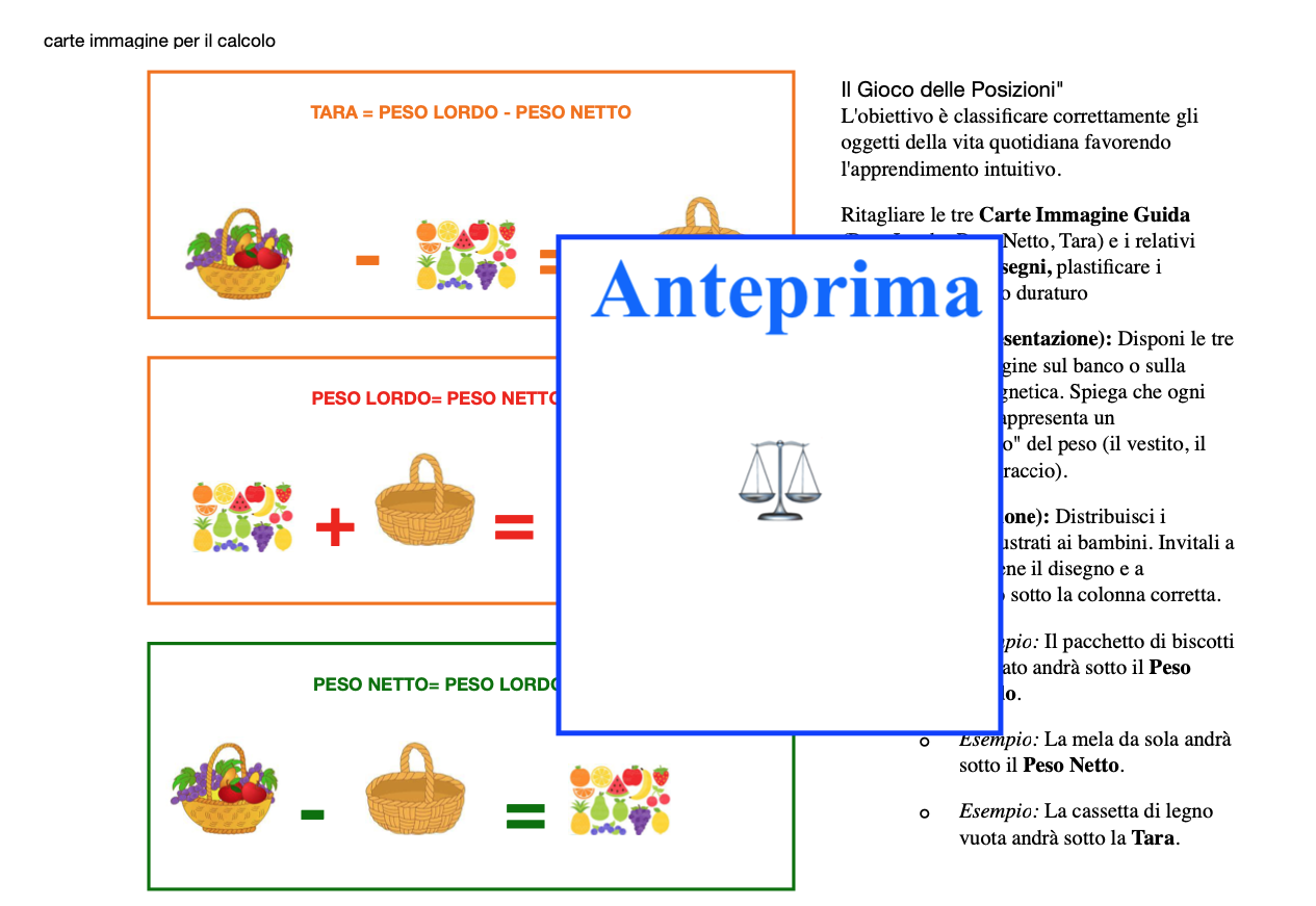 Le Carte Immagine e il Gioco delle Posizioni permettono ai bambini di classificare e comprendere i tre pesi prima ancora di formalizzarli. -