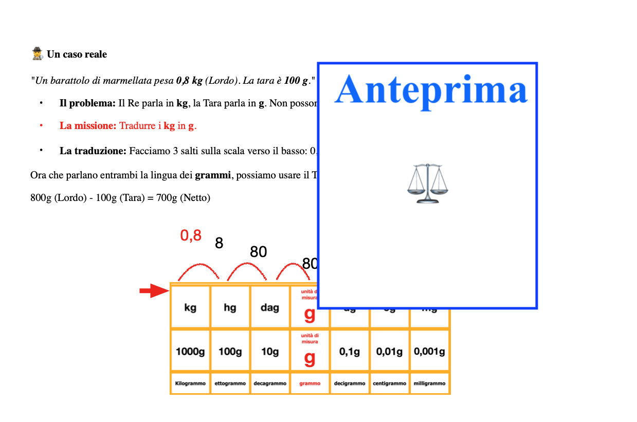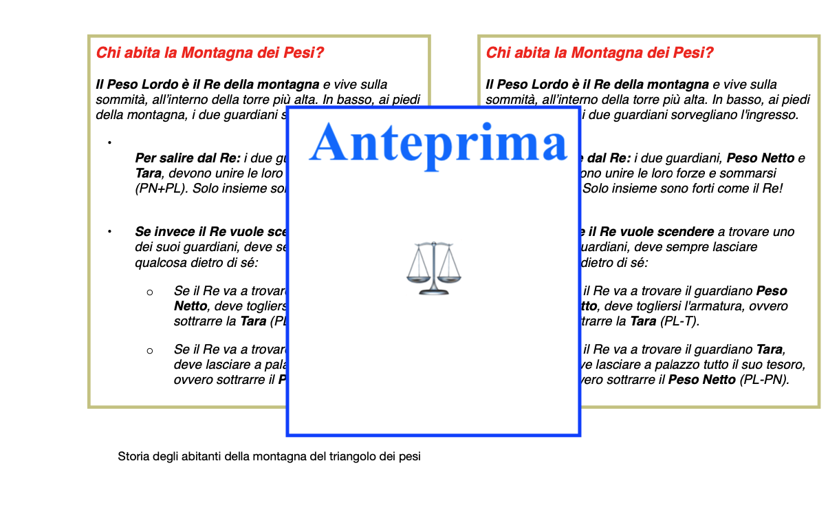 La storia del Re (Peso Lordo) e dei Guardiani (Peso Netto e Tara) trasforma le formule in immagini mentali durature. -